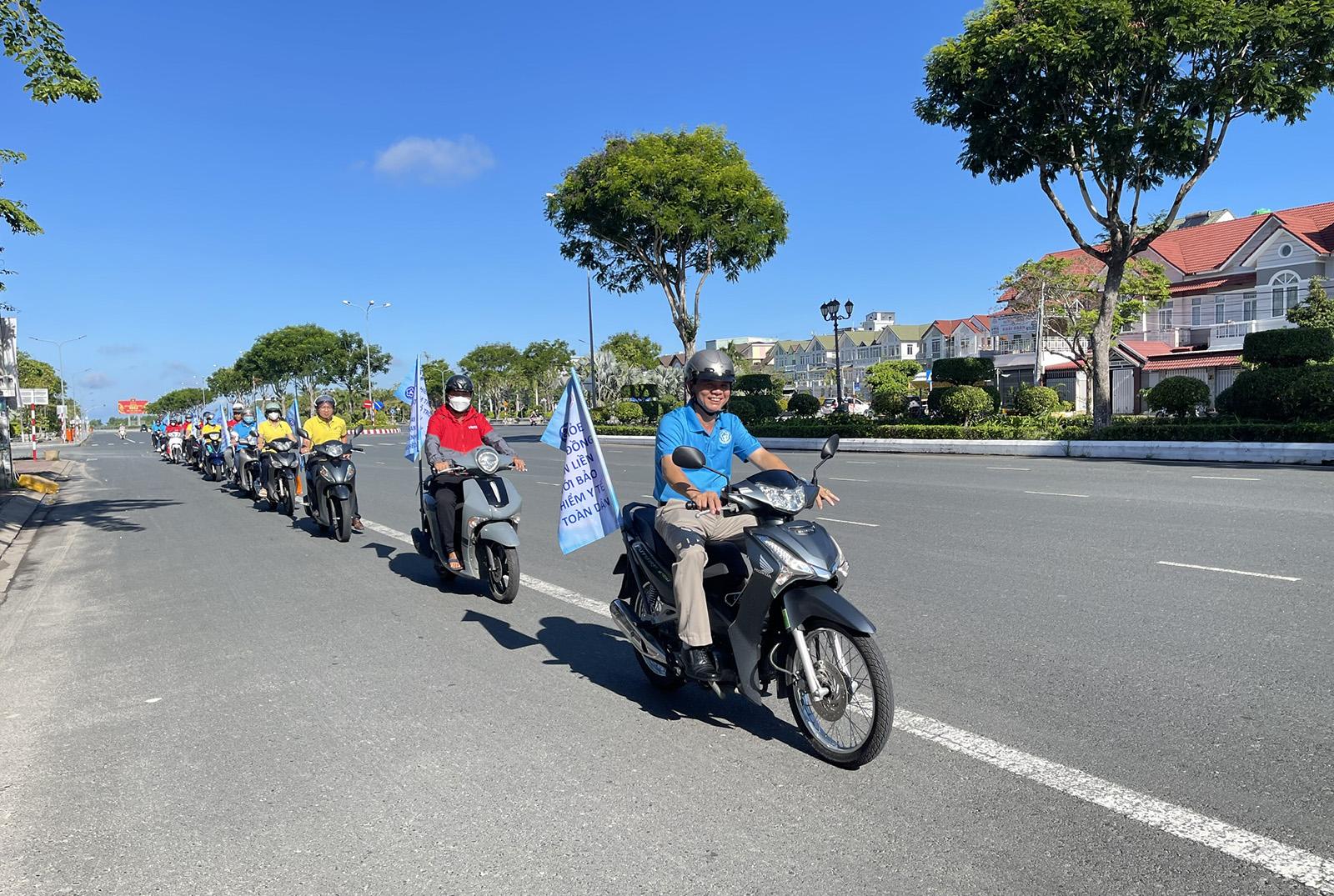 Bảo hiểm xã hội tỉnh phối hợp Bưu điện tỉnh ra quân tuyên truyền chính sách, pháp luật về bảo hiểm xã hội, bảo hiểm y tế trên địa bàn phường Rạch Giá. Ảnh: CẨM TÚ