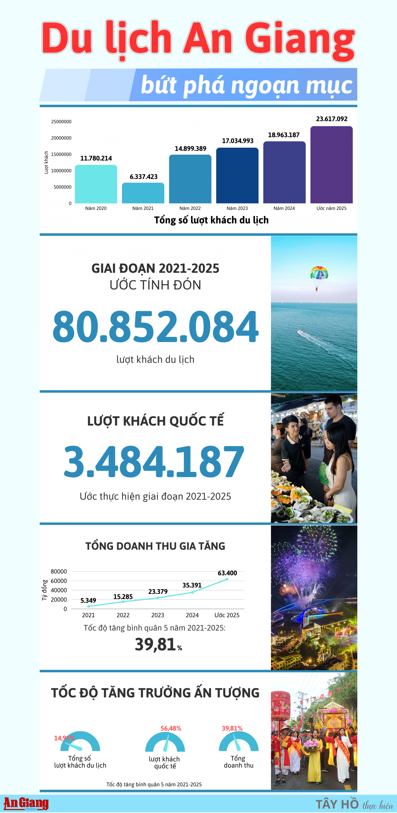 - Du lịch An Giang giai đoạn 2021 - 2025 ghi nhận sự bứt phá ngoạn mục với hơn 80,8 triệu lượt khách, vượt chỉ tiêu kế hoạch và khẳng định sức hút điểm đến du lịch. Lượng khách quốc tế tăng nhanh, đạt trên 3,4 triệu lượt. Doanh thu du lịch hơn 142.800 tỷ đồng, tốc độ tăng bình quân gần 40%/năm - trở thành một trong những động lực mới cho tăng trưởng kinh tế - xã hội của tỉnh.