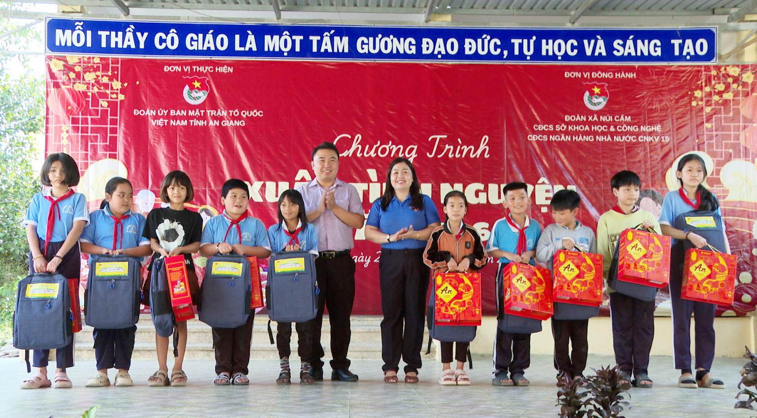 Chị Thị Phương Hồng, Phó Bí thư Thường trực Tỉnh đoàn, Chủ tịch Hội Liên hiệp Thanh niên Việt Nam tỉnh An Giang và đồng chí Đỗ Minh Sang, Phó Bí thư Thường trực Đảng ủy xã Núi Cấm tặng quà cho học sinh.
