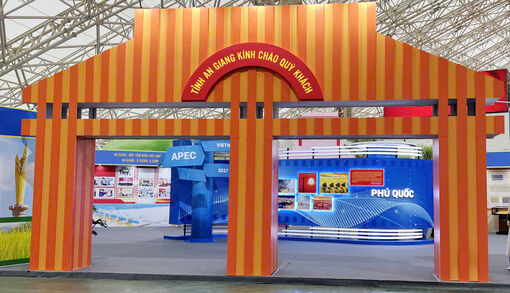 Cổng chào triển lãm tỉnh An Giang, nổi bật với không gian giới thiệu về APEC 2027 tại Phú Quốc.