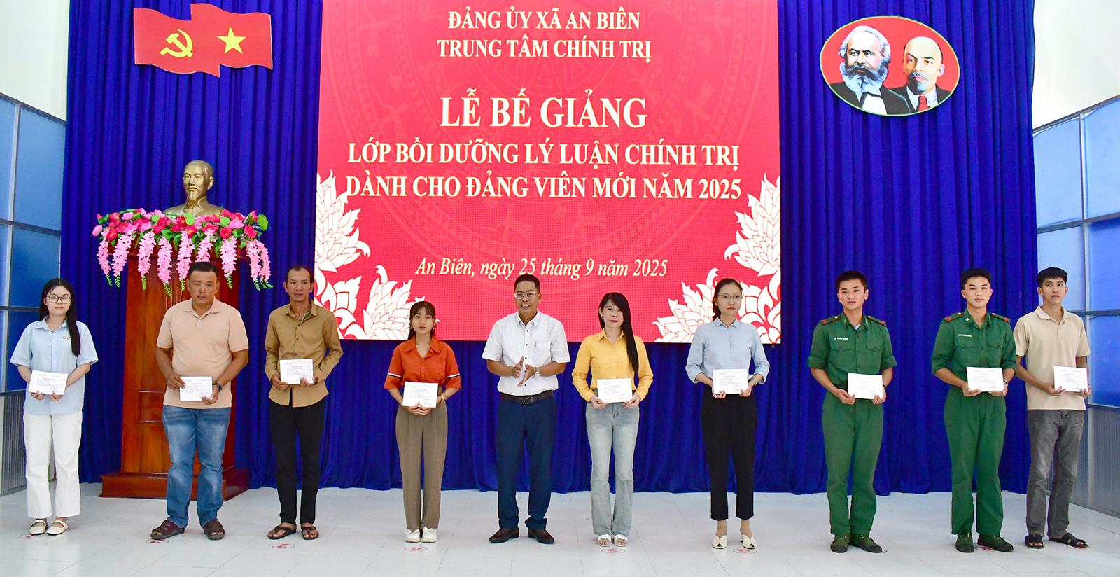Chiều 25/9, Trung tâm Chính trị xã An Biên (tỉnh An Giang) tổ chức bế giảng lớp bồi dưỡng lý luận chính trị dành cho đảng viên mới năm 2025. Tham gia lớp học có 35 học viên từ các chi bộ, đảng bộ xã An Biên, Đông Thái, Tây Yên và các đơn vị lực lượng vũ trang đóng quân trên địa bàn.