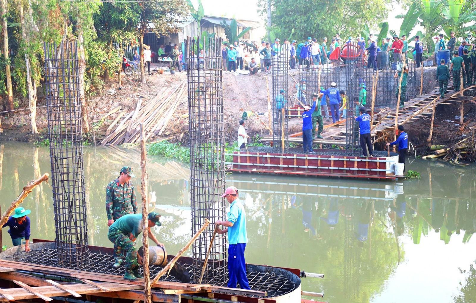 Lực lượng vũ trang và người dân tham gia đổ bê tông cầu Kênh 7 - Nam Kênh Quốc Gia trên địa bàn xã Châu Phú. Ảnh: MINH QUÂN
