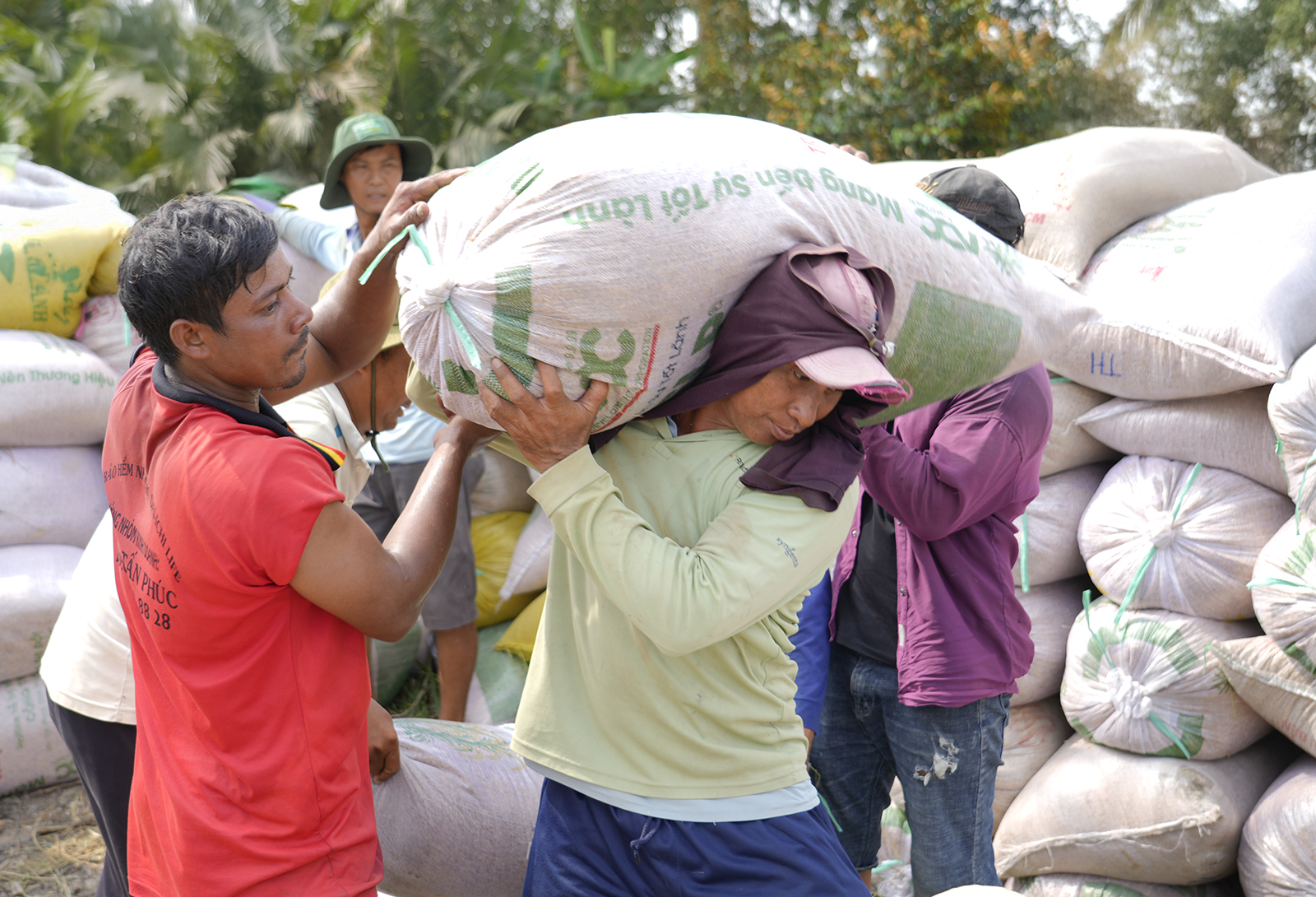 Nông dân xã Gò Quao bán lúa cho thương lái.