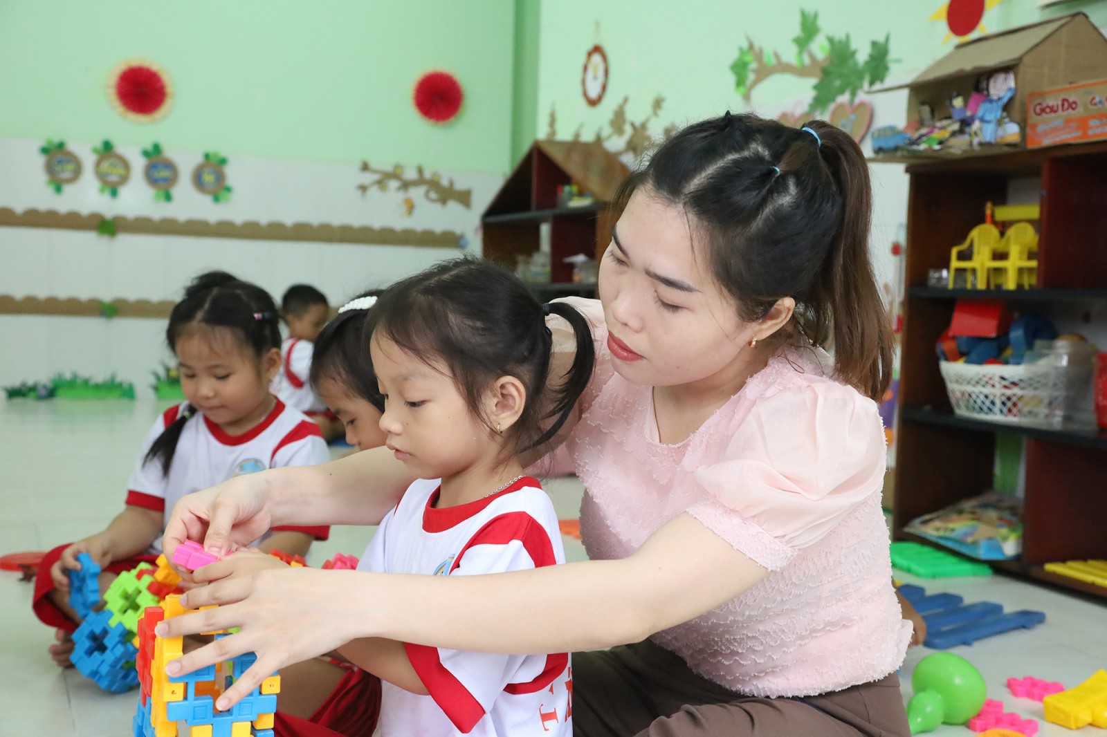 Giáo viên Trường Mẫu giáo Ánh Dương, phường Vĩnh Thông trong giờ dạy trẻ.