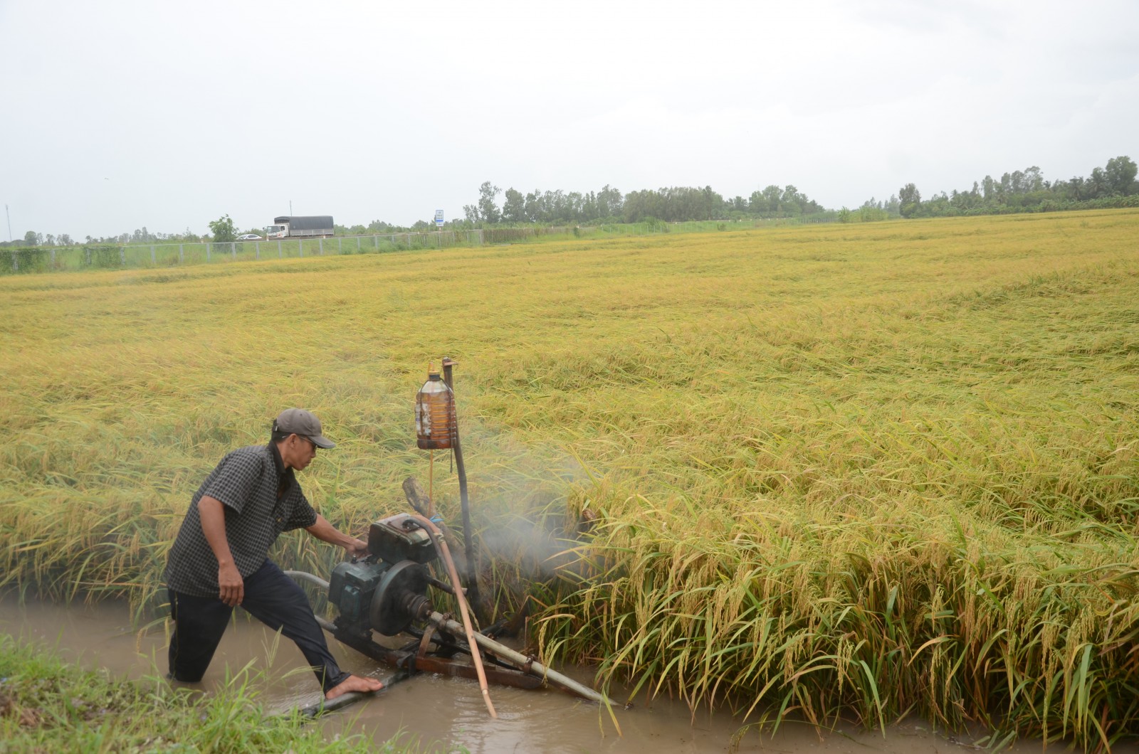 Nông dân xã Thạnh Lộc bơm nước tiêu úng, chống ngập.