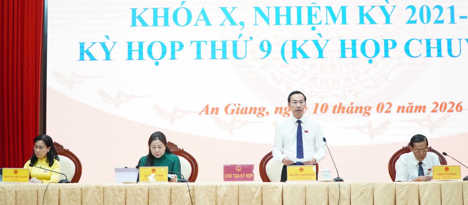 Phát biểu bế mạc kỳ họp, Chủ tịch HĐND tỉnh An Giang Nguyễn Thanh Nhàn khẳnh định HĐND tỉnh đã tập trung nghiên cứu, thảo luận dân chủ và thống nhất cao, thông qua 4 nghị quyết và 1 báo cáo quan trọng, bảo đảm đúng trình tự, thủ tục. Đây là những quyết nghị có ý nghĩa thiết thực, tạo cơ sở pháp lý để tổ chức thực hiện các nhiệm vụ phát triển kinh tế - xã hội, huy động và phân bổ hiệu quả các nguồn lực, góp phần thúc đẩy tiến độ các dự án trọng điểm và thực hiện mục tiêu phát triển của tỉnh trong giai đoạn đầu của Kế hoạch 5 năm 2026 - 2030.
