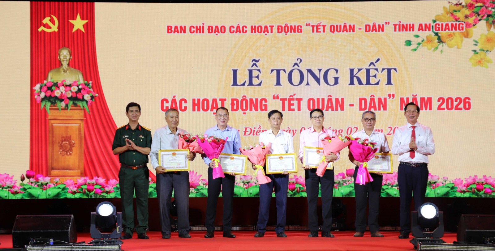 Dịp này, Ban Chỉ đạo các hoạt động Tết Quân - Dân tỉnh An Giang tổ chức tiếp nhận bảng tượng trưng kinh phí tài trợ và trao bằng khen của Chủ tịch UBND tỉnh cùng hoa tri ân cho các đơn vị tài trợ tiêu biểu.