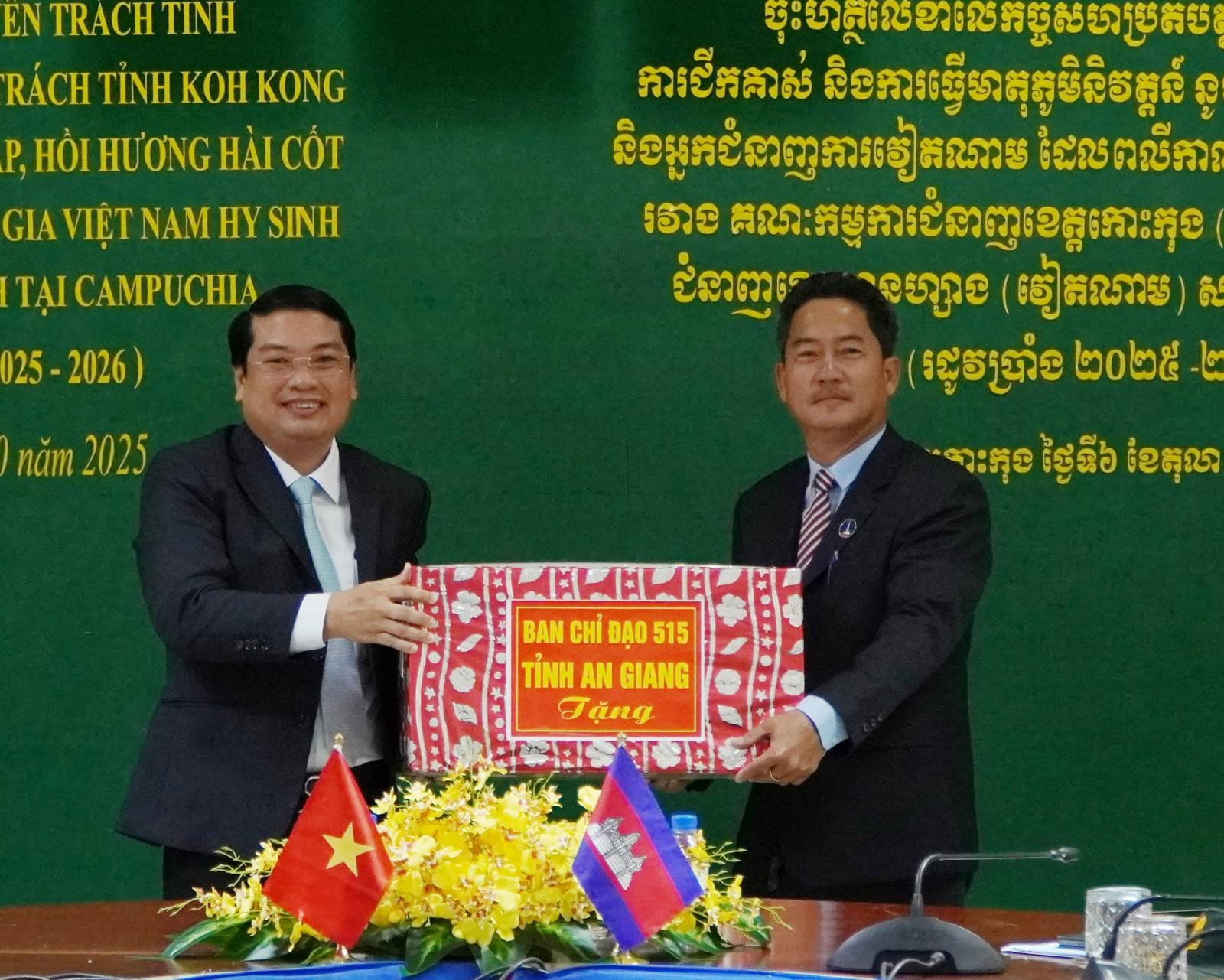Dịp này, Ban Chuyên trách tỉnh An Giang được ủy quyền của Ban Chuyên trách Chính phủ Việt Nam trao kinh phí hỗ trợ Ban Chuyên trách tỉnh Koh Kong trong phối hợp tổ chức các hoạt động giúp Đội K92 tìm kiếm, quy tập hài cốt liệt sĩ quân tình nguyện và chuyên gia Việt Nam hy sinh trong các thời kỳ chiến tranh tại Campuchia trên địa bàn tỉnh Koh Kong mùa khô 2025 - 2026.