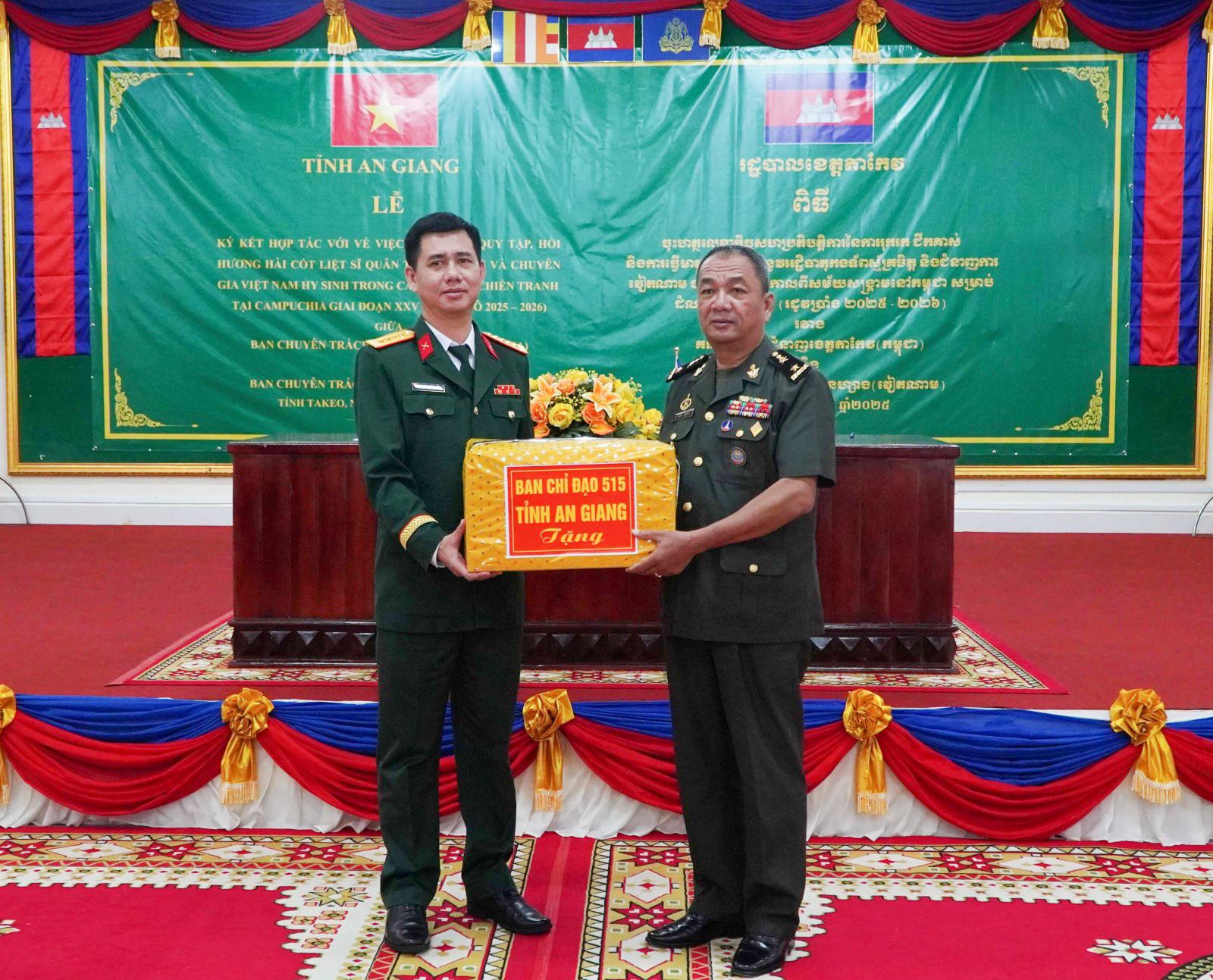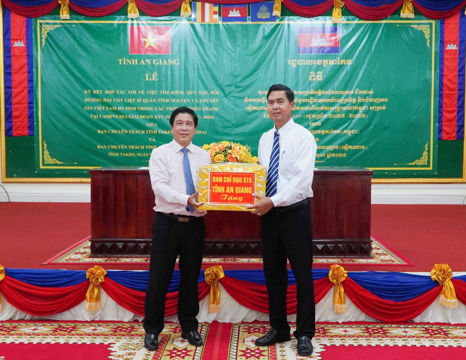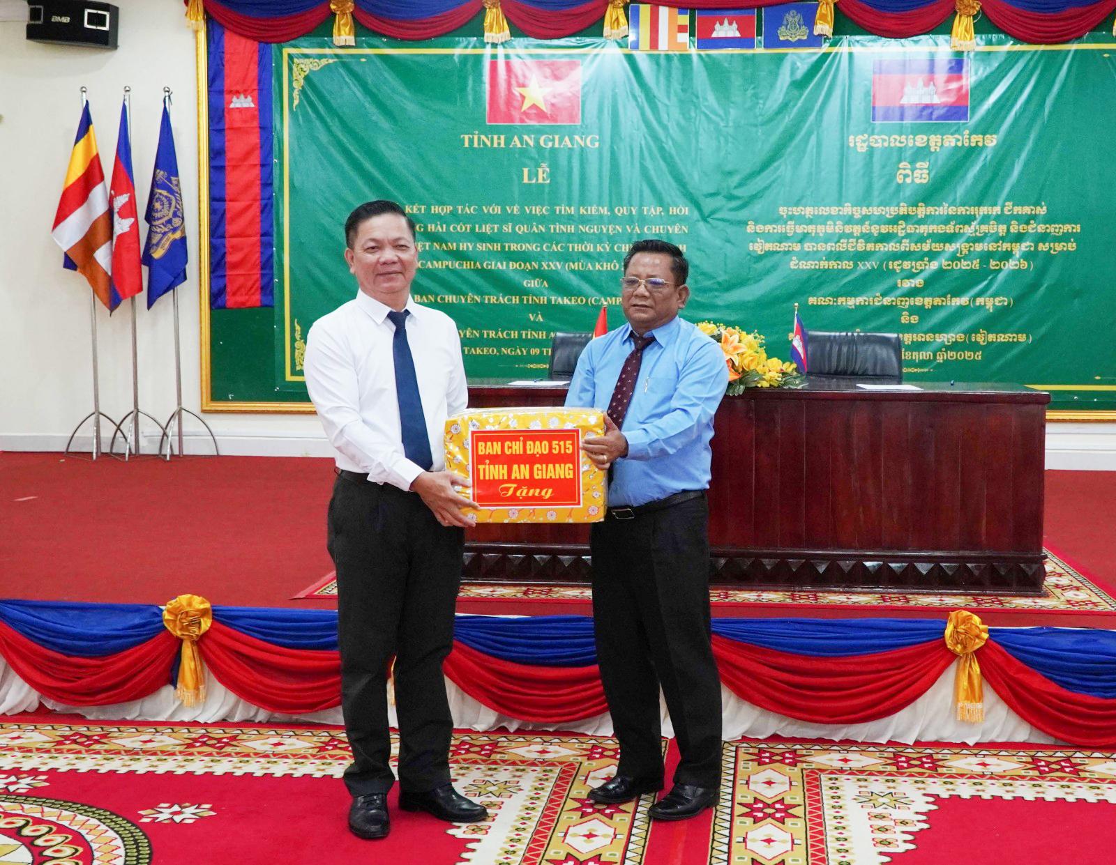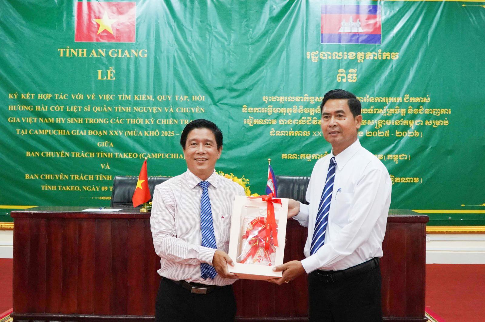 Phát biểu tại buổi lễ, ngài Sut Khon - Phó Tỉnh trưởng, Trưởng Ban Chuyên trách tỉnh Takeo vui mừng chào đón đoàn đại biểu tỉnh An Giang đến tổ chức lễ ký kết. Đồng thời đánh giá cao thời gian qua hai tỉnh Takeo - An Giang đã hợp tác tìm kiếm, quy tập, hồi hương hài cốt liệt sĩ quân tình nguyện và chuyên gia Việt Nam hy sinh trong các thời kỳ chiến tranh tại Campuchia trên địa bàn tỉnh Takeo đạt nhiều kết quả.