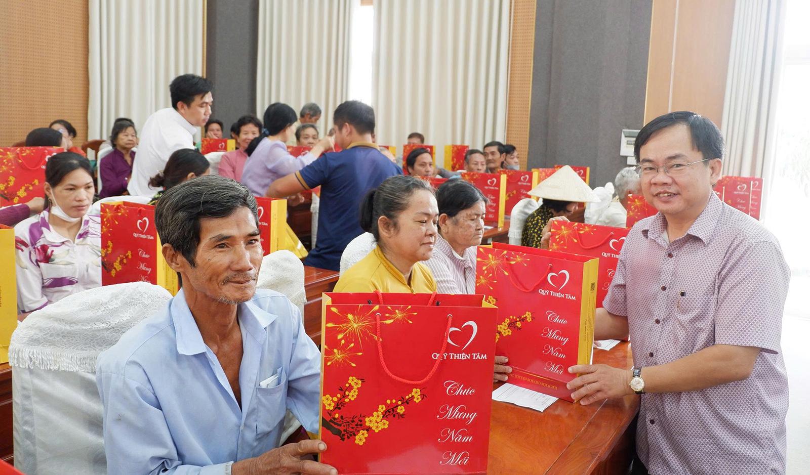 Thường trực Ủy ban Mặt trận Tổ quốc Việt Nam tỉnh cùng nhà hảo tâm trao quà cho người dân xã Gò Quao. Ảnh: THU OANH