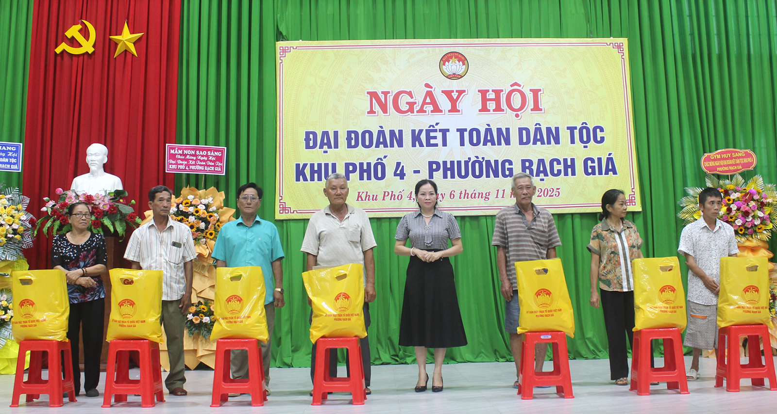 Chủ tịch Ủy ban Mặt trận Tổ quốc Việt Nam phường Rạch Giá Nguyễn Thị Phương Thủy (thứ 3, từ phải qua) tặng quà gia đình chính sách. Ảnh: MỘC TRÀ