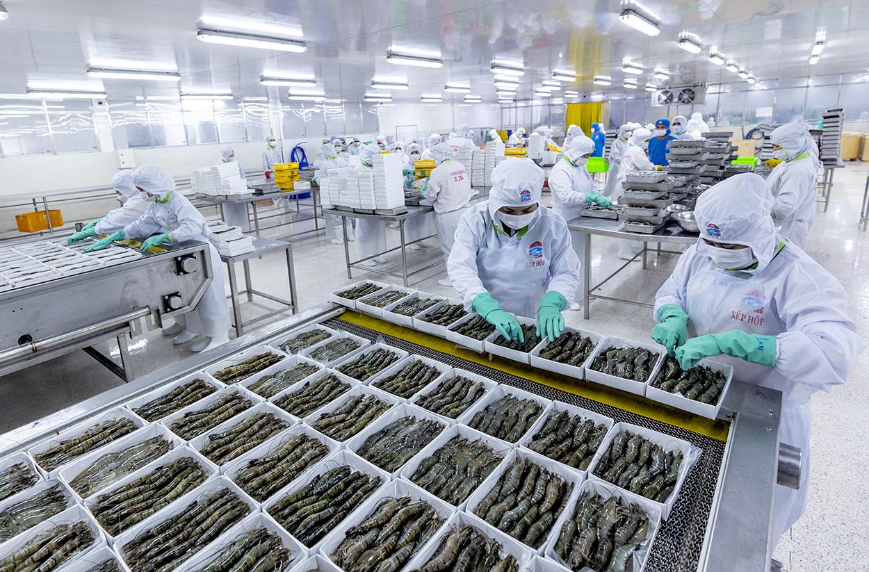 Công nhân Công ty Cổ phần Chế biến thủy sản xuất nhập khẩu Kiên Cường, khu cảng cá Tắc Cậu đang xếp tôm lên băng chuyền để đông lạnh. Ảnh: KIỀU DIỄM