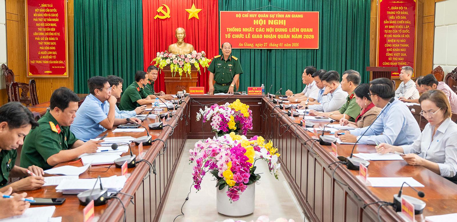 Tại hội nghị, các đại biểu đã nghe báo cáo tóm tắt công tác chuẩn bị và các nội dung đề xuất liên quan đến công tác tổ chức lễ giao nhận quân năm 2026 của UBND tỉnh. Đây là năm đầu tiên An Giang tổ chức tuyển quân gắn với mô hình chính quyền địa phương 2 cấp. Lễ giao nhận quân sẽ được tổ chức tại 9 địa điểm, trong đó có 2 điểm truyền hình trực tiếp.