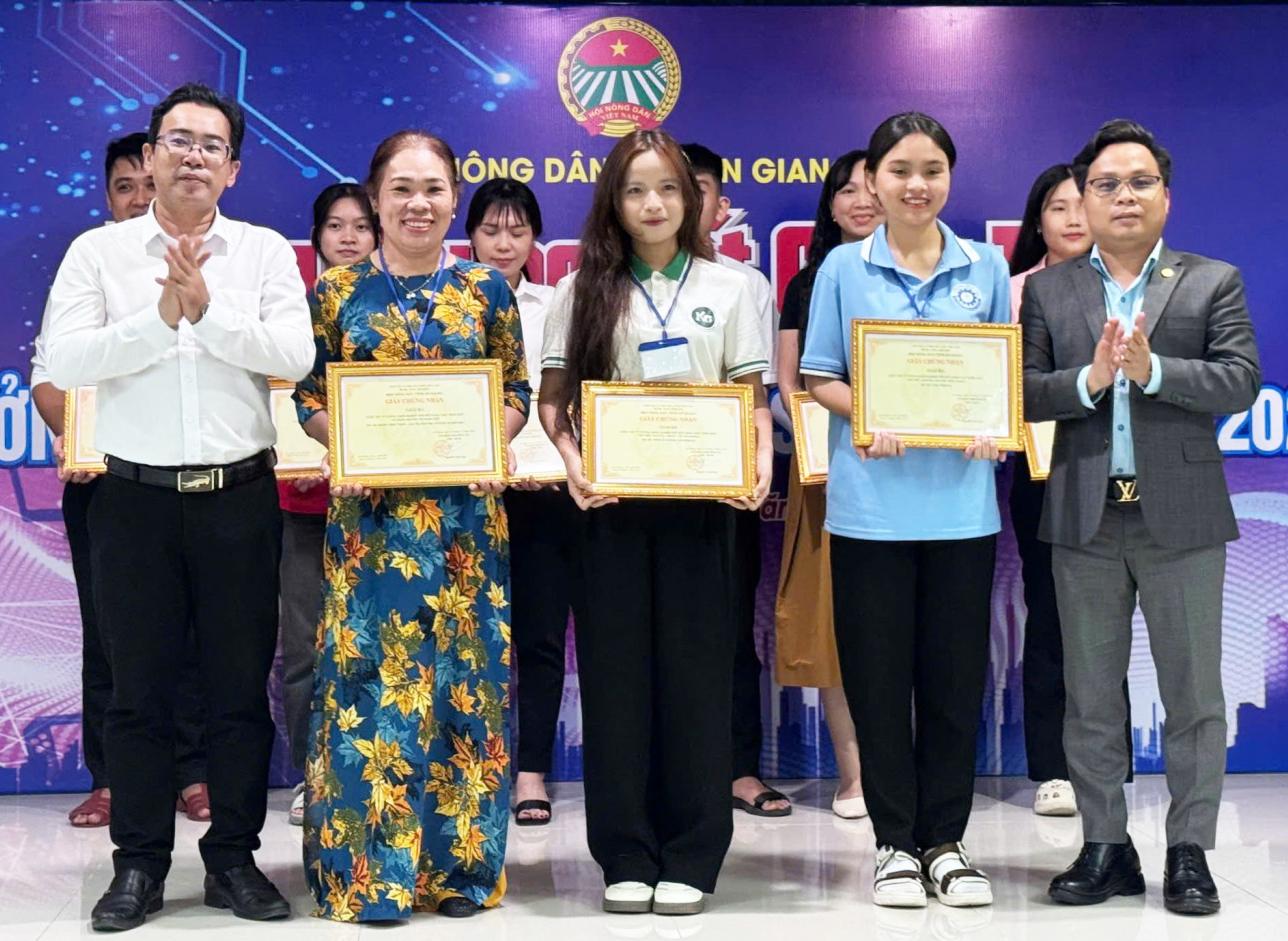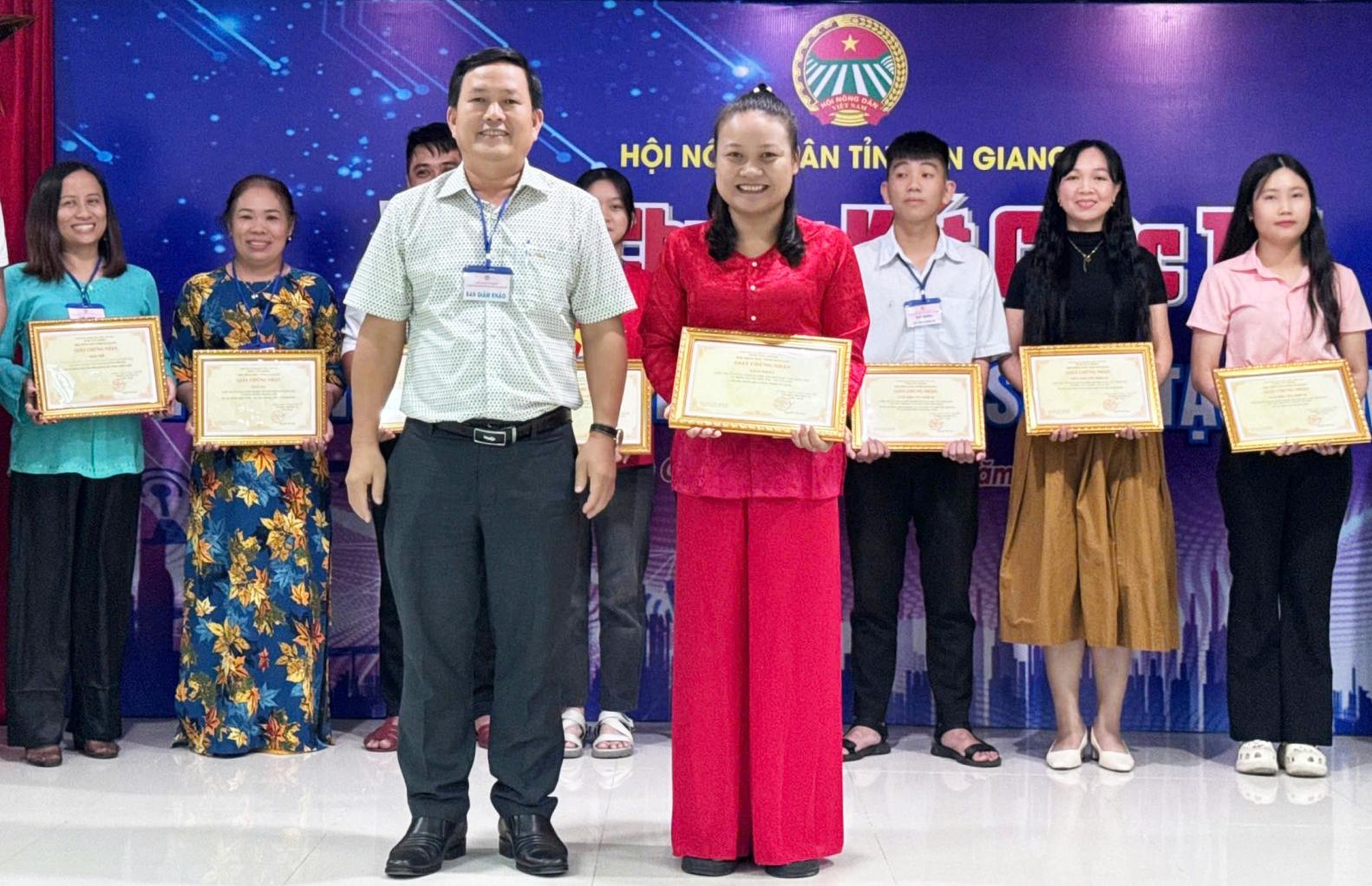 Phó Chủ tịch Thường trực Hội Nông dân tỉnh An Giang Lâm Quốc Toàn (bìa trái) trao giải nhì cho các thí sinh.