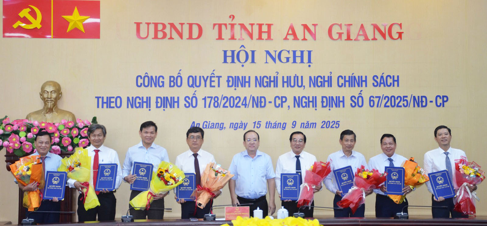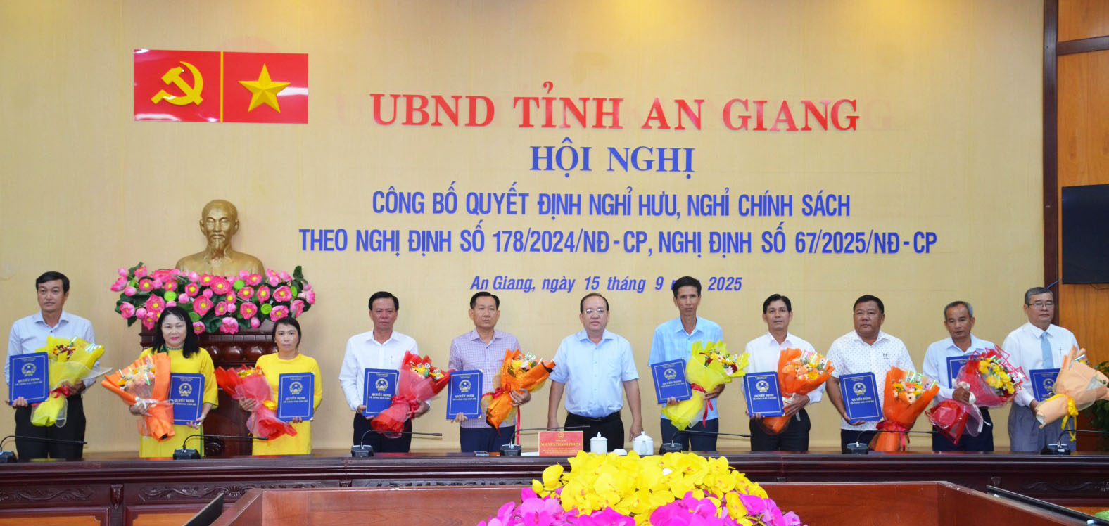 Chiều 15/9, UBND tỉnh An Giang tổ chức hội nghị công bố quyết định nghỉ hưu, nghỉ chính sách theo Nghị định số 178/2024/NĐ-CP và Nghị định số 67/2025/NĐ-CP đối với các cá nhân lãnh đạo, quản lý thuộc thẩm quyền quản lý của UBND tỉnh An Giang.