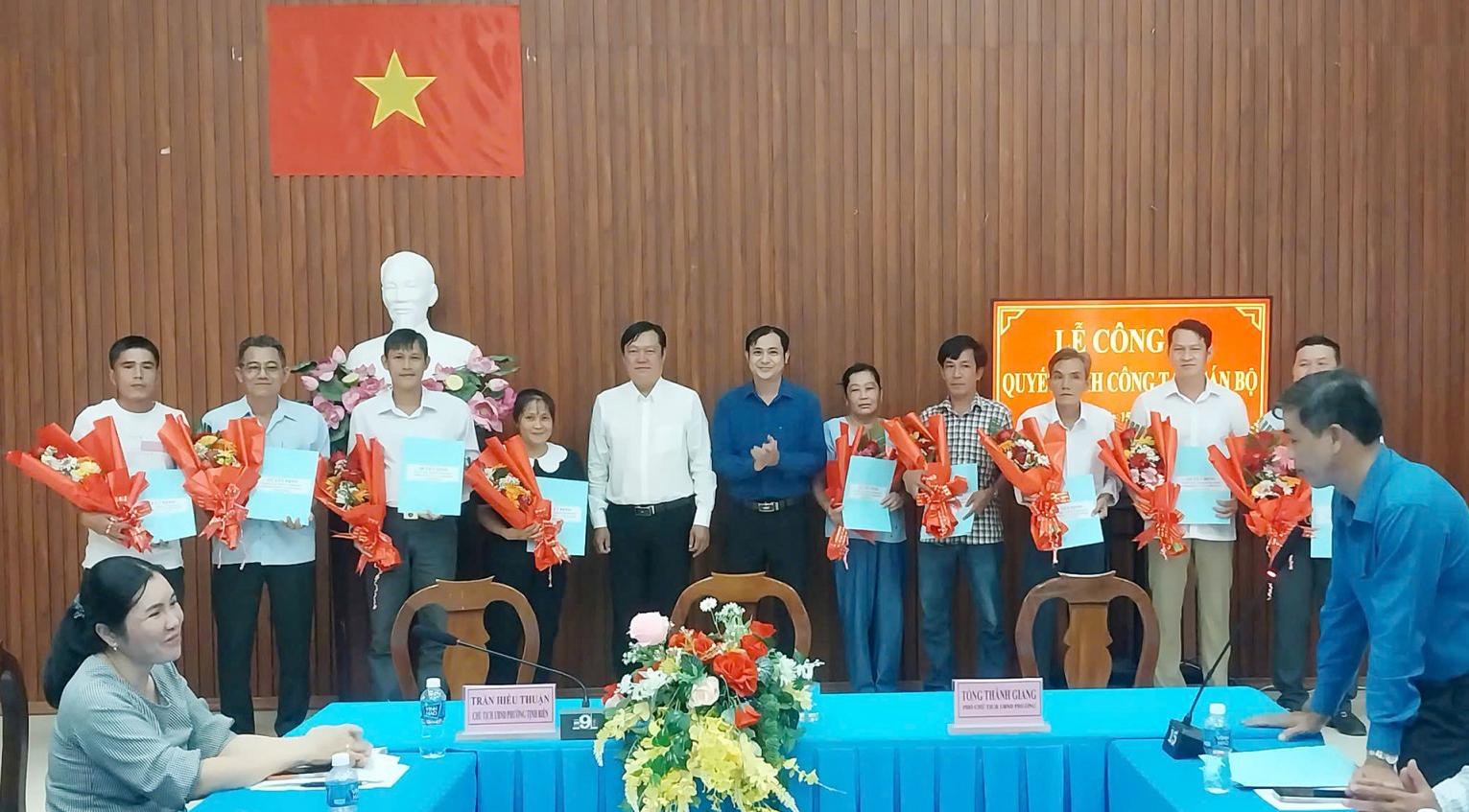 Lãnh đạo xã Mỹ Hòa Hưng trao quyết định và tặng hoa cho cán bộ.
