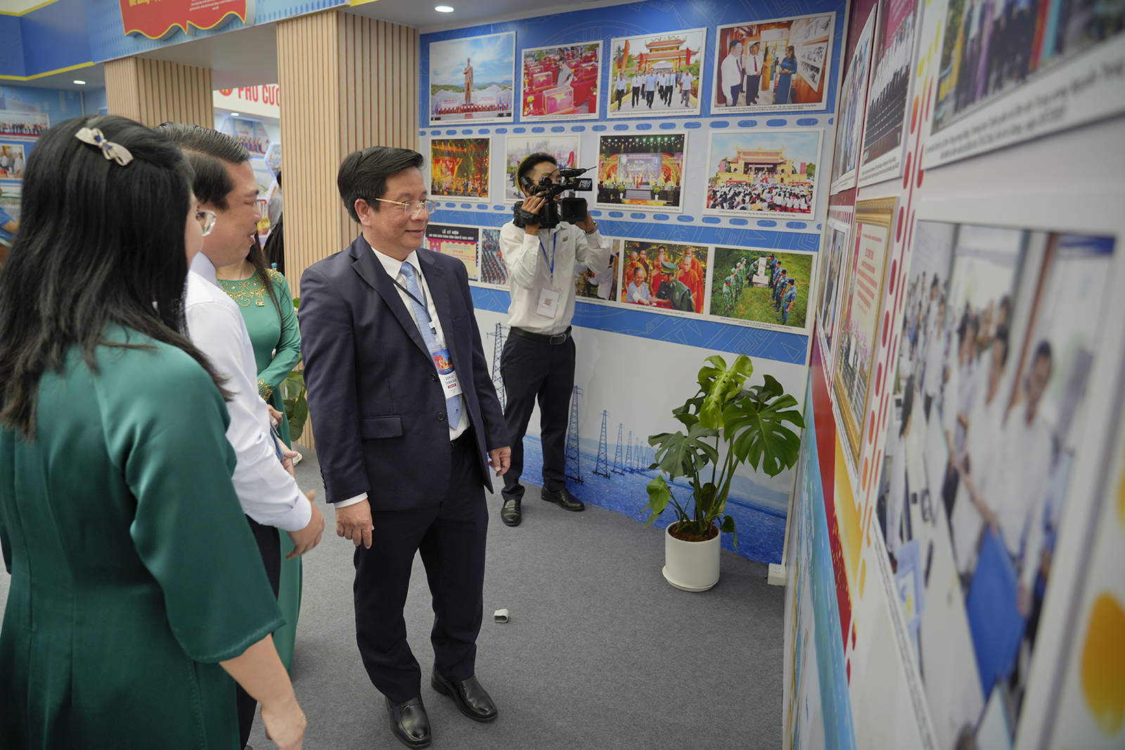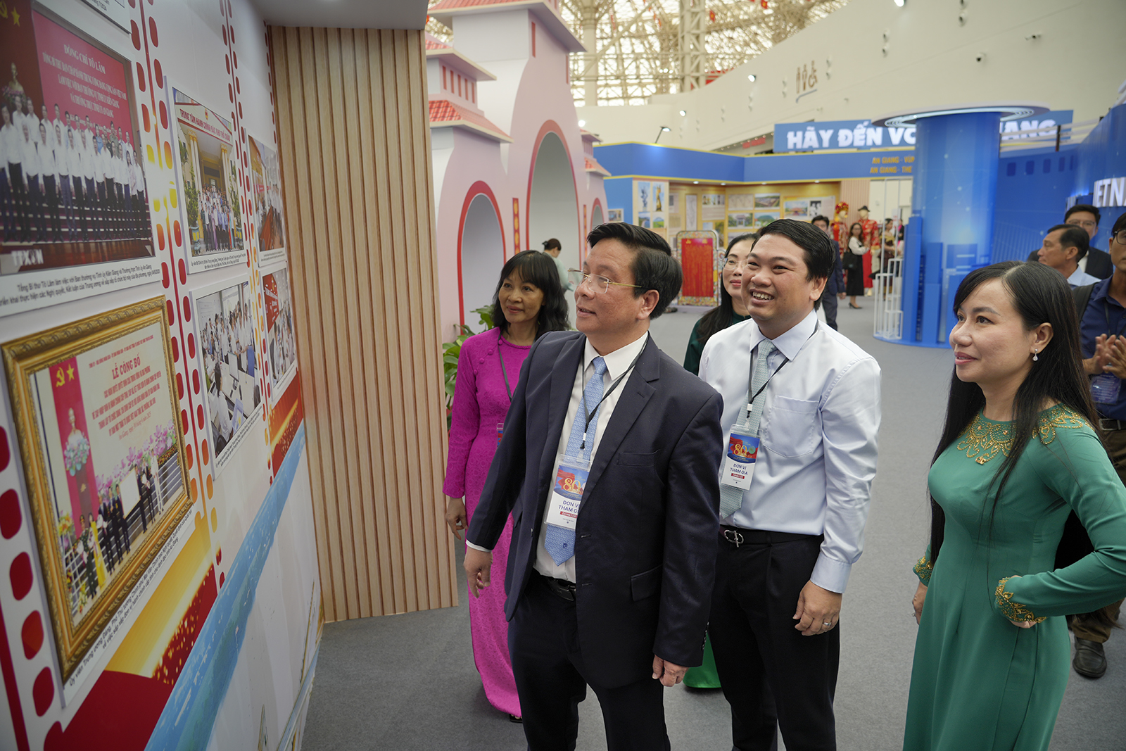 Ủy viên dự khuyết Ban Chấp hành Trung ương Đảng, Phó Bí thư Tỉnh ủy, Chủ tịch UBND tỉnh An Giang Hồ Văn Mừng cùng lãnh đạo tỉnh, sở, ngành tham quan không gian trưng bày hình ảnh kinh tế - xã hội của tỉnh An Giang.