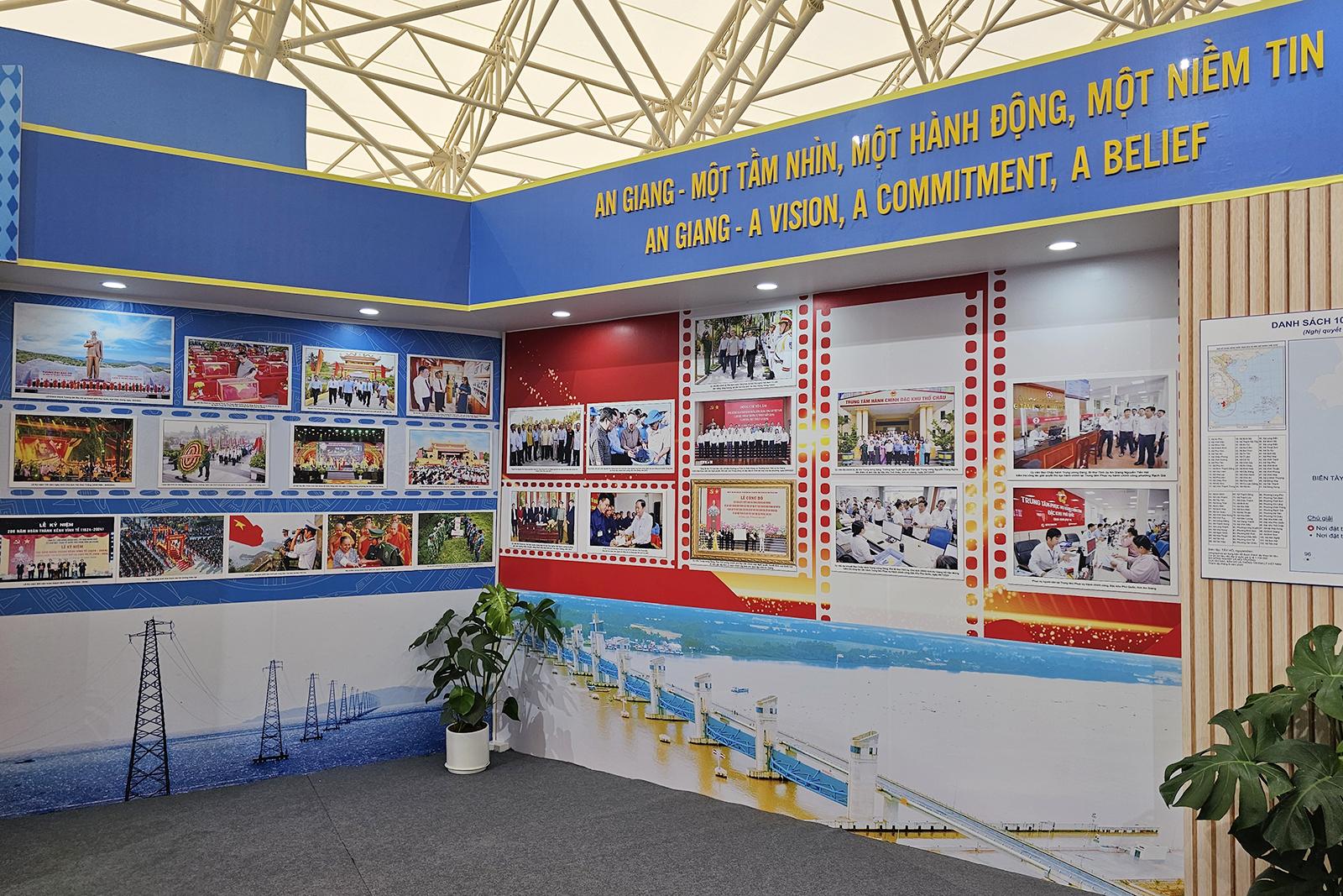 Không gian trưng bày của tỉnh An Giang với điểm nhấn là thông điệp “An Giang - Một tầm nhìn, Một hành động, Một niềm tin” cùng những hình ảnh phản ánh chặng đường phát triển toàn diện của địa phương.