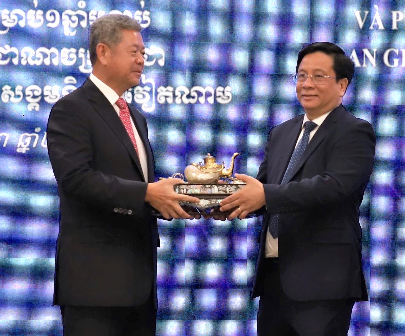 Chủ tịch UBND tỉnh An Giang Hồ Văn Mừng tặng quà Tỉnh trưởng tỉnh Kandal Kuoch Chamroeun.