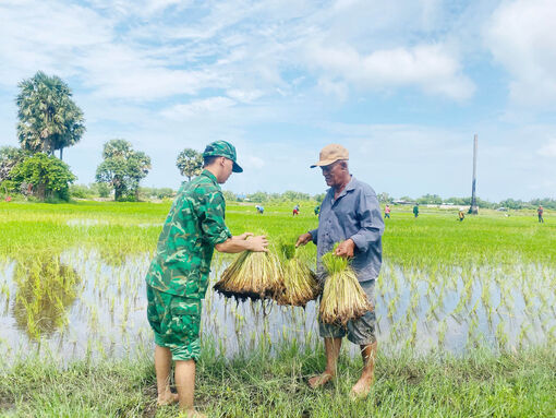 Cán bộ, chiến sĩ Đồn Biên phòng Cửa khẩu Quốc tế Hà Tiên giúp người dân dặm lúa.