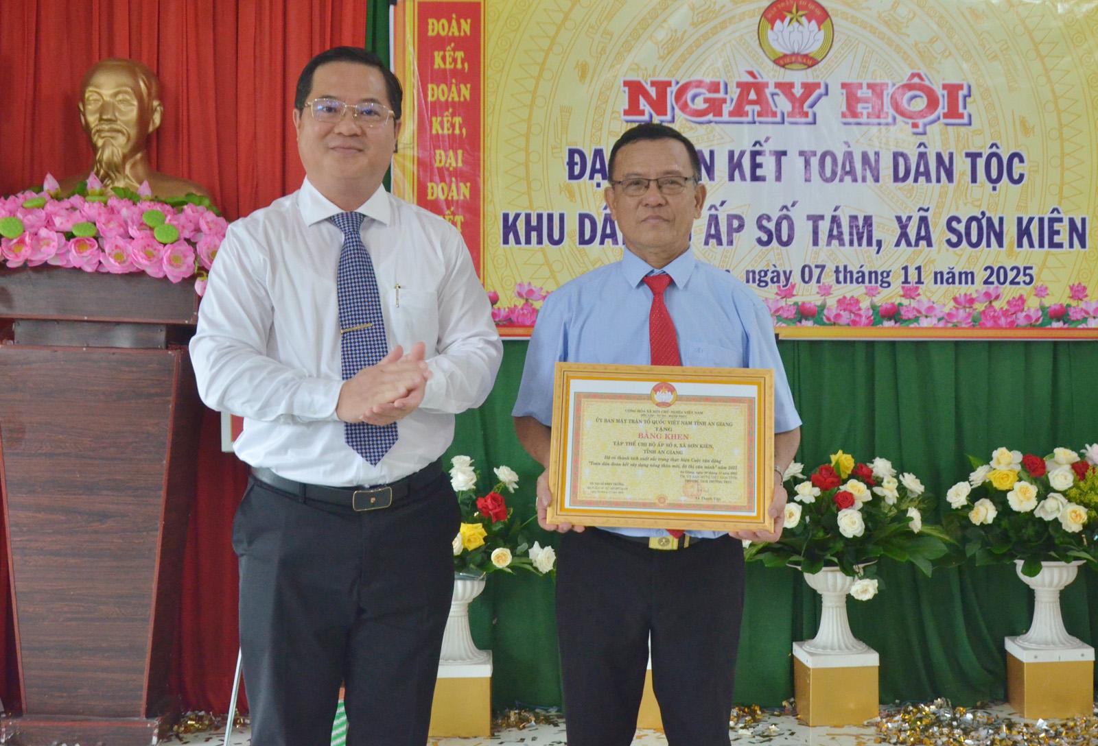 Dịp này, Ủy ban MTTQ Việt Nam tỉnh An Giang tặng bằng khen 1 tập thể, 1 cá nhân ấp Số Tám đã có thành tích xuất sắc trong thực hiện cuộc vận động “Toàn dân đoàn kết xây dựng nông thôn mới, đô thị văn minh” năm 2025; tặng 10 suất quà cho hộ nghèo trên địa bàn ấp Số Tám (500.000 đồng/suất).