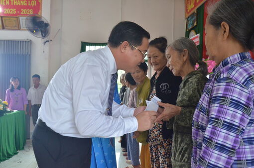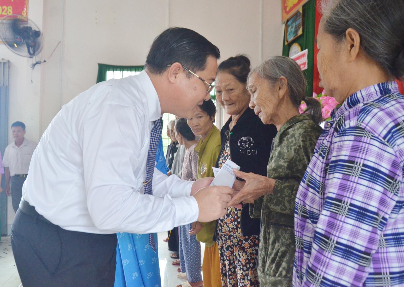 Ủy viên Ban Thường vụ, Chủ nhiệm Ủy ban Kiểm tra Tỉnh ủy An Giang Huỳnh Quốc Thái trao quà cho hộ nghèo trên địa bàn ấp Số Tám.