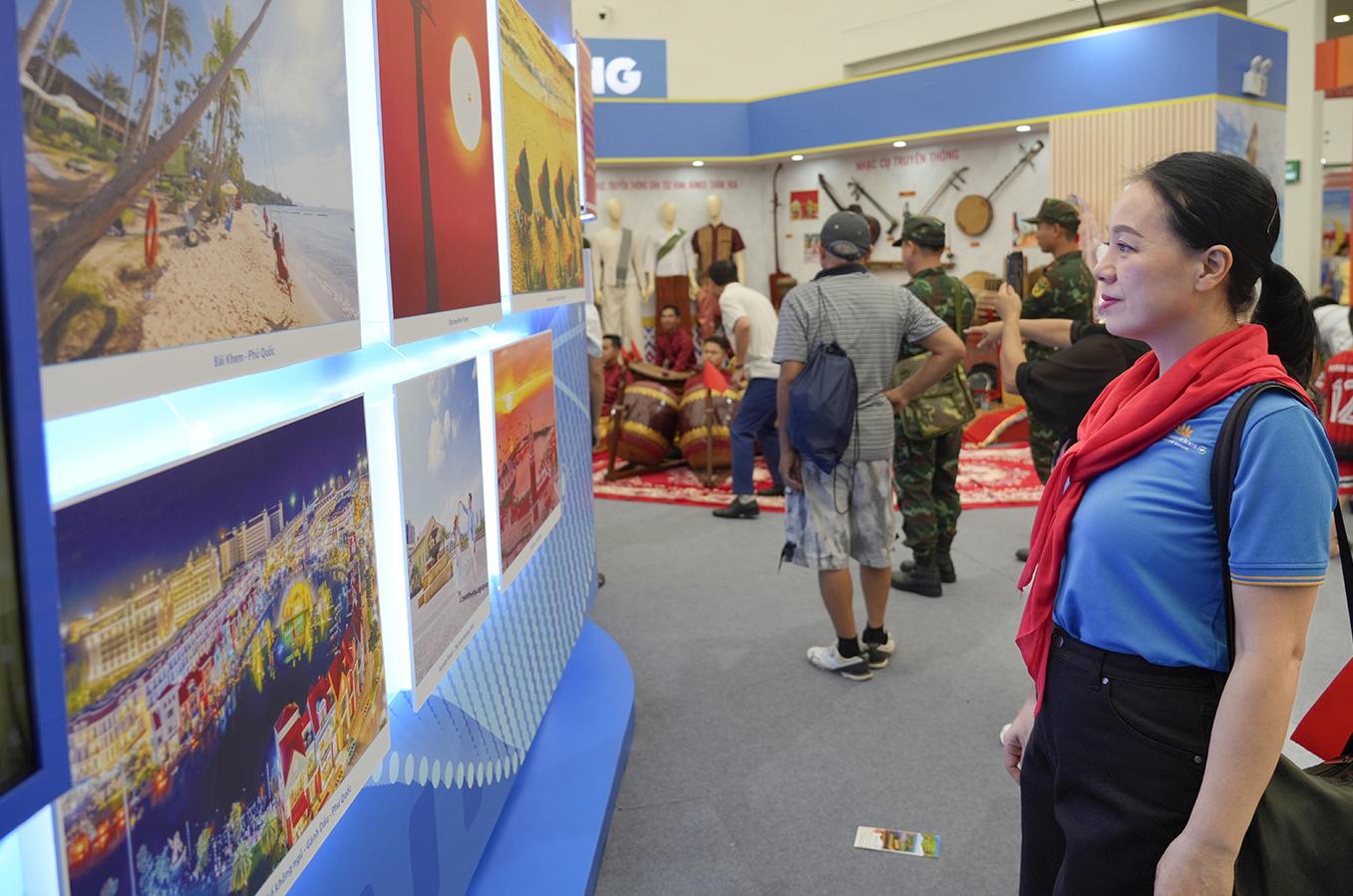 Cùng hoạt động quảng bá của tỉnh, sự xuất hiện của Sun PhuQuoc Airways tại triển lãm cũng tạo ấn tượng mạnh. Không gian trưng bày được thiết kế hiện đại, nổi bật với mô hình máy bay thu nhỏ và hệ thống màn hình LED chiếu liên tục những thước phim giới thiệu mạng bay “trục nan” lấy Phú Quốc làm trung tâm, kết nối trực tiếp tới các thành phố lớn trong và ngoài nước.