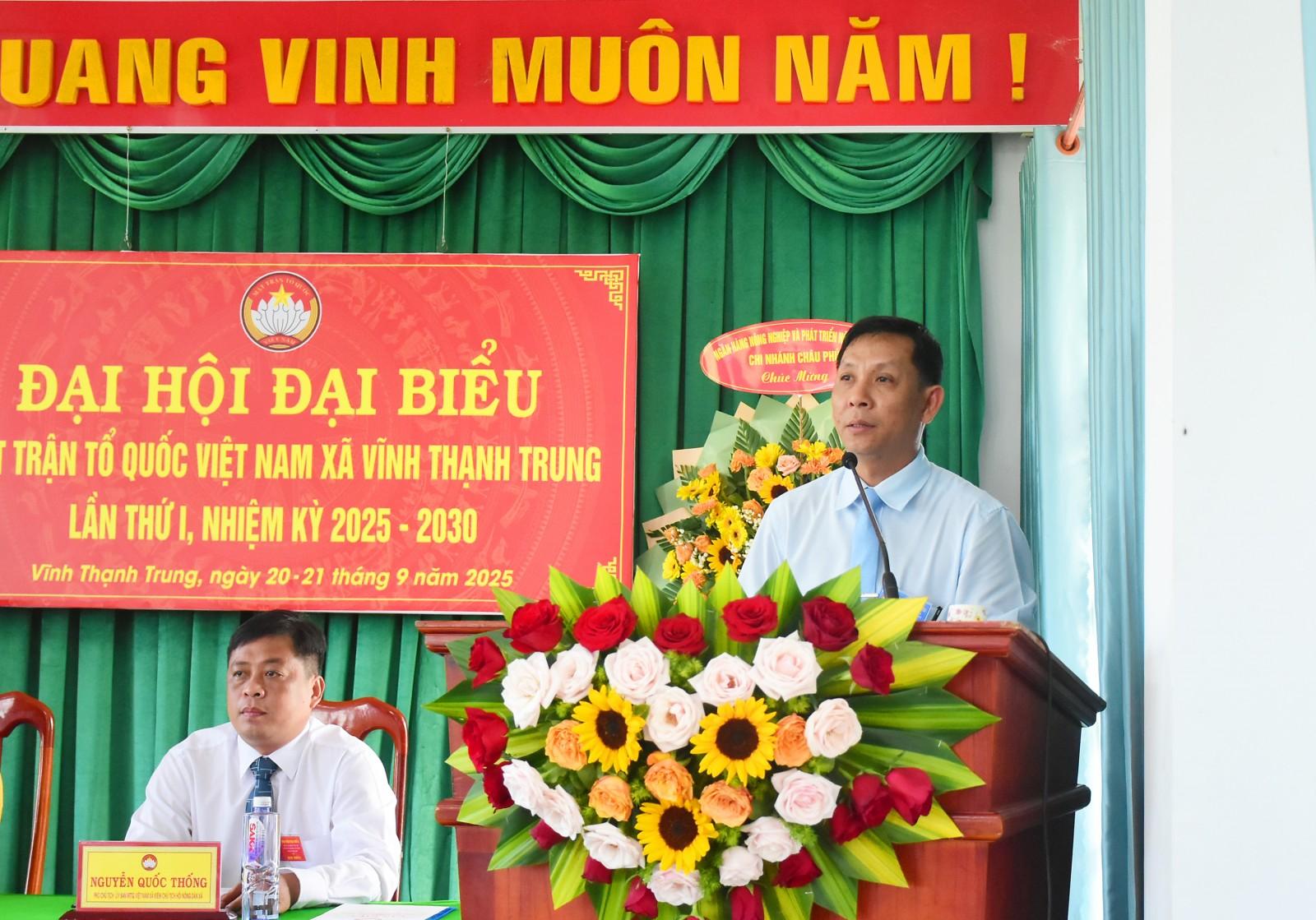 Phát biểu tại Đại hội, Chủ tịch Hội Cựu chiến binh tỉnh Bùi Vũ Tấn đề nghị UBMTTQVN xã Vĩnh Thạnh Trung hướng mạnh hoạt động về cơ sở, phát huy vai trò của người có uy tín, các chức sắc tôn giáo, cán bộ Mặt trận trong xây dựng, phát huy khối đoàn kết dân tộc. Đẩy mạnh các phong trào thi đua yêu nước, chương trình xây dựng nông thôn mới, công tác an sinh xã hội, bảo vệ môi trường và giữ gìn an ninh trật tự tại địa phương.