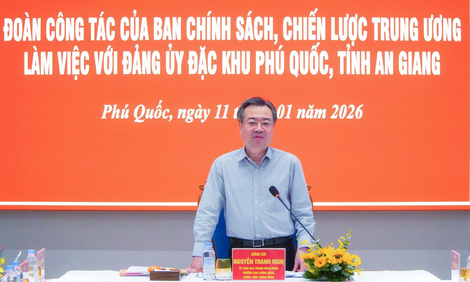 Qua buổi làm việc, Trưởng ban Chính sách, chiến lược Trung ương Nguyễn Thanh Nghị đề nghị tỉnh An Giang và đặc khu Phú Quốc tiếp tục quán triệt và triển khai nghiêm túc các chủ trương, nghị quyết của Trung ương và chỉ đạo của Tổng Bí thư Tô Lâm trong chuyến làm việc với Ban Thường vụ tỉnh An Giang ngày 20/11/2025 về việc phát triển đặc khu Phú Quốc. Trong đó, tập trung phát triển Phú Quốc trở thành trung tâm du lịch, dịch vụ chất lượng cao; du lịch biển, đảo tầm cỡ quốc gia và quốc tế; là thành phố (nay là đặc khu) thông minh, hiện đại, văn minh, xanh, sạch, đẹp, an toàn và đáng sống; phát triển du lịch Phú Quốc theo hướng có bản sắc riêng, gắn với phát huy giá trị văn hóa dân tộc.