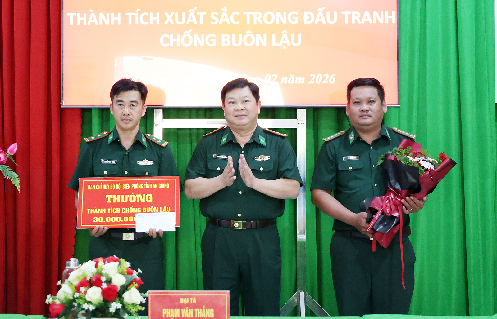 Đại tá Phạm Văn Thắng, Phó Chỉ huy trưởng Bộ Chỉ huy Quân sự tỉnh, Chỉ huy trưởng Ban Chỉ huy Bộ đội Biên phòng tỉnh An Giang trao thưởng cho tập thể Đội Đặc nhiệm phòng, chống ma túy và tội phạm.