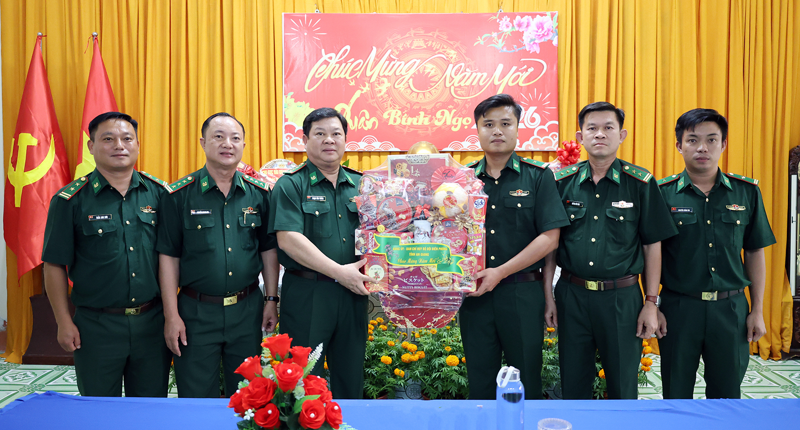 Đại tá Trần Ngọc Châu, Phó Chỉ huy trưởng, Tham mưu trưởng Ban Chỉ huy Bộ đội Biên phòng tỉnh An Giang tặng hoa chúc mừng Thượng tá Trần Viết Đức (bìa trái) và Thiếu tá Phạm Văn Bé Em.