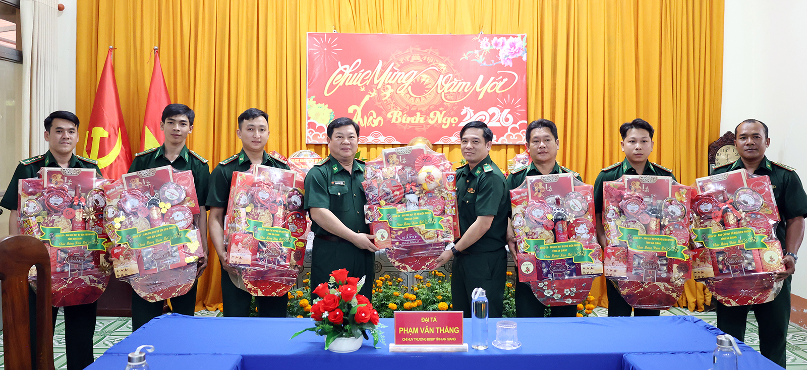 Đại tá Phạm Văn Thắng, Phó Chỉ huy trưởng Bộ Chỉ huy Quân sự tỉnh, Chỉ huy trưởng Ban Chỉ huy Bộ đội Biên phòng tỉnh An Giang tặng quà Tết cho cán bộ, chiến sĩ các trạm, chốt thuộc Đồn Biên phòng Cửa khẩu Long Bình.