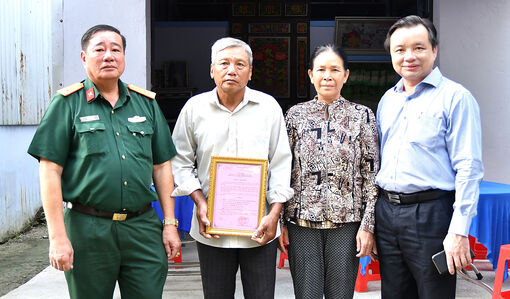 Đại tá Võ Văn Nam, Phó Sư đoàn trưởng Sư đoàn 4, Quân khu 9 và Bí thư Đảng ủy xã Hòn Đất Dương Minh Tâm đến dự và trao quyết định bàn giao nhà.