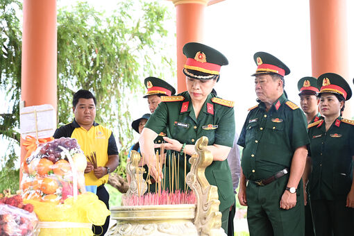 Đại tá Nguyễn Thị Thu Hiền, Trưởng Ban Phụ nữ Quân đội dâng hương tại mộ Anh hùng Lực lượng vũ trang nhân dân Phan Thị Ràng