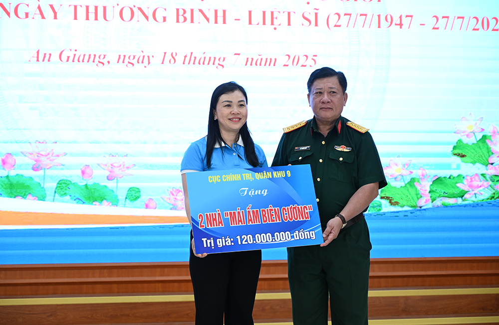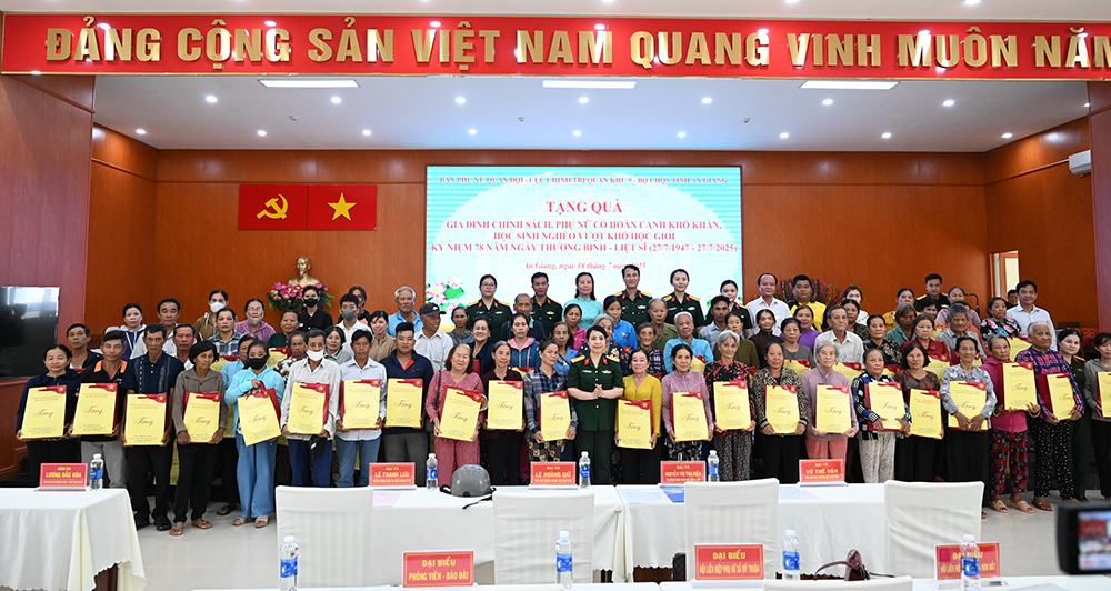 Tại buổi lễ, Ban Phụ nữ Quân đội, Cục Chính trị Quân khu 9, Bộ Chỉ huy Quân sự tỉnh An Giang trao 100 suất quà cho gia đình chính sách và phụ nữ có hoàn cảnh khó khăn và 15 suất học bổng cho học sinh vượt khó học giỏi xã Hòn Đất và xã Mỹ Thuận; hỗ trợ kinh phí nhà “Mái ấm biên cương” năm 2025 cho 2 gia đình phụ nữ biên giới tỉnh An Giang (trị giá 60 triệu đồng/căn).