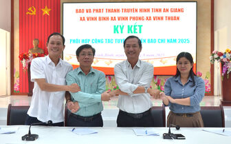 Phó Giám đốc phụ trách Báo và Phát thanh - Truyền hình tỉnh An Giang Lê Văn Chuyển (thứ 2, từ phải qua) ký kết phối hợp công tác tuyên truyền báo chí năm 2025 với lãnh đạo 3 xã Vĩnh Bình, Vĩnh Thuận, Vĩnh Phong. Ảnh: MI NI