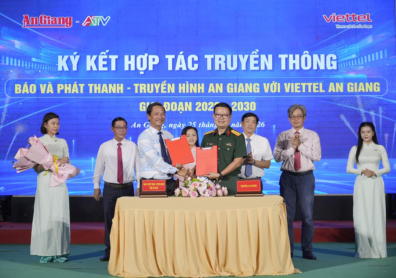 Phó Giám đốc phụ trách Báo và Phát thanh - Truyền hình An Giang Lê Văn Chuyển và Giám đốc Viettel An Giang Đỗ Thanh Tuấn ký kết hợp tác truyền thông giai đoạn 2026 - 2030.