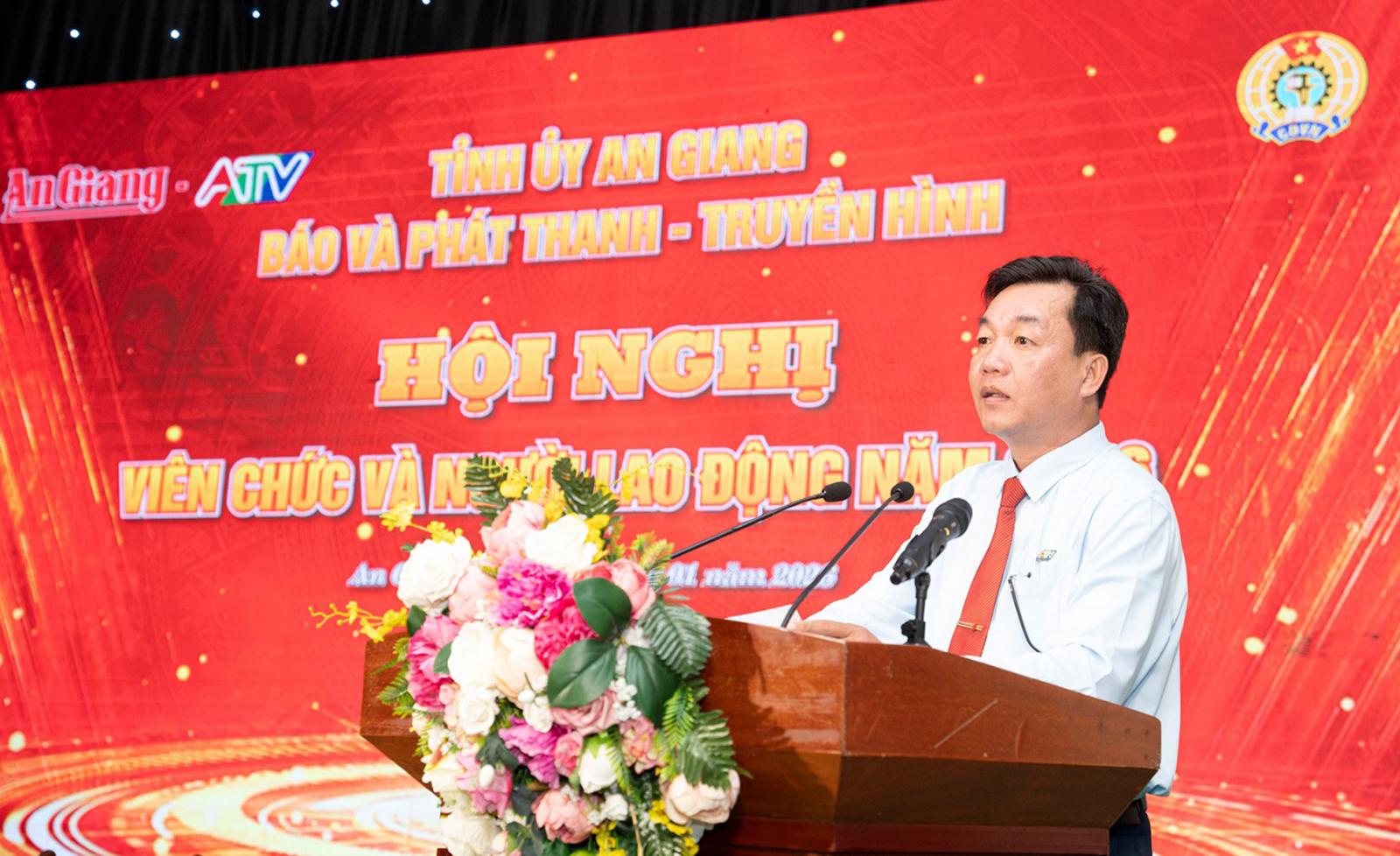 Phó Giám đốc, Chủ tịch Công đoàn cơ sở Báo và Phát thanh - Truyền hình tỉnh An Giang Nguyễn Công Tính phát biểu tại hội nghị.