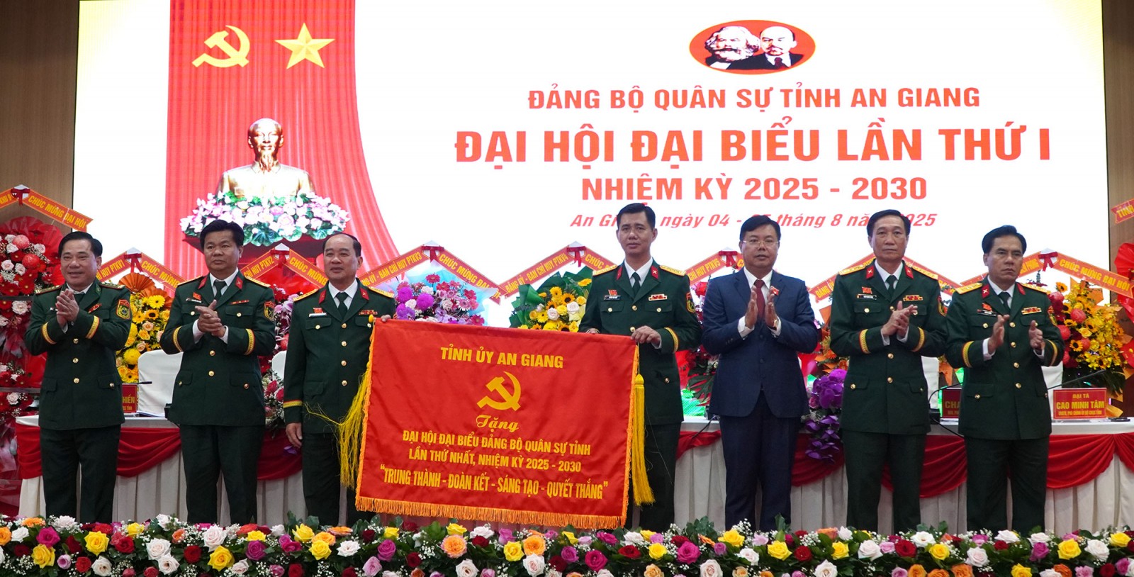 Ủy viên Trung ương Đảng, Bí thư Tỉnh ủy An Giang Nguyễn Tiến Hải (thứ ba, từ phải qua) trao bức trướng của Tỉnh ủy tặng Đại hội đại biểu Đảng bộ Quân sự tỉnh An Giang lần thứ I, nhiệm kỳ 2025 - 2030.