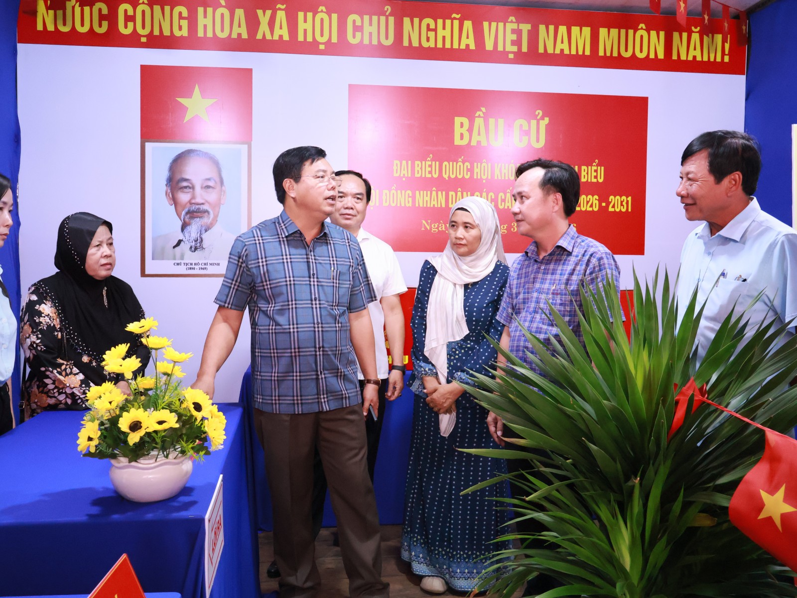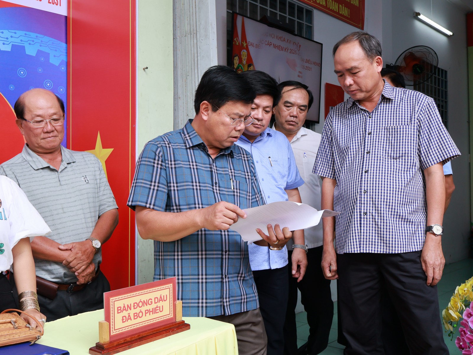 Bí thư Tỉnh ủy An Giang Nguyễn Tiến Hải (thứ 2, từ trái sang) kiểm tra công tác bầu cử khu vực bỏ phiếu số 9, ấp Phũm Soài, xã Châu Phong.