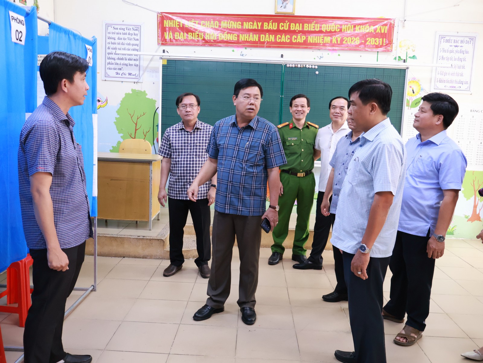 Bí thư Tỉnh ủy Nguyễn Tiến Hải (thứ 3 từ trái sang) kiểm tra công tác bầu cử tại khu vực bỏ phiếu số 12, Trường Tiểu học Trưng Vương, khóm Châu Quới 3, phường Châu Đốc.