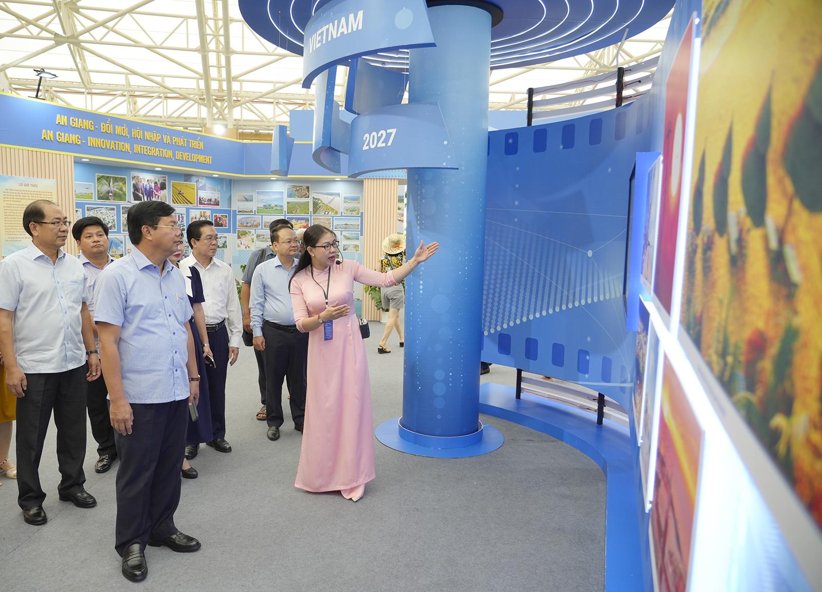 Bí thư Tỉnh ủy An Giang Nguyễn Tiến Hải, cùng đoàn công tác thăm gian trưng bày của tỉnh An Giang tại Triển lãm thành tựu đất nước.