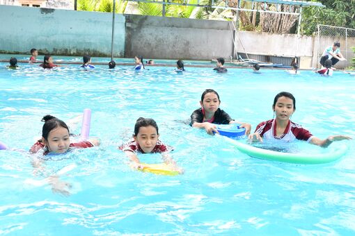 Các em đang tham gia học bơi an toàn, phòng tránh tai nạn đuối nước.