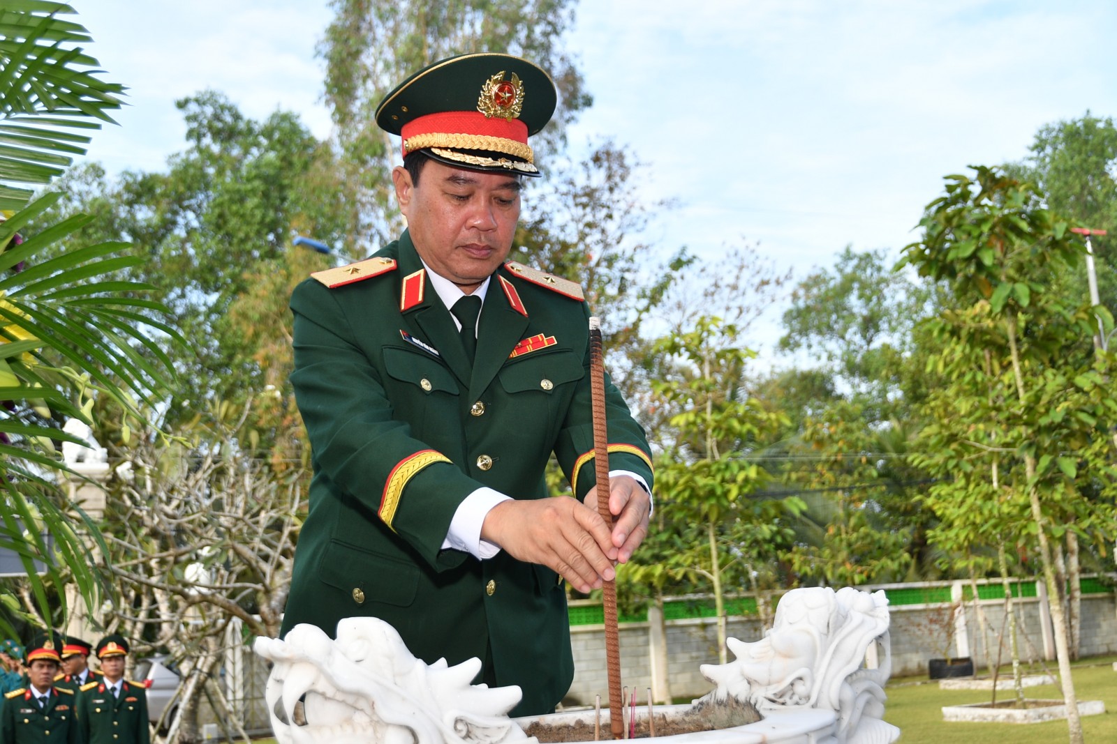 Thiếu tướng Nguyễn Văn Ngành, Ủy viên Ban Thường vụ Tỉnh ủy, Chỉ huy trưởng Bộ Chỉ huy Quân sự tỉnh dâng hương tại Bia lưu niệm Lực lượng vũ trang tỉnh.