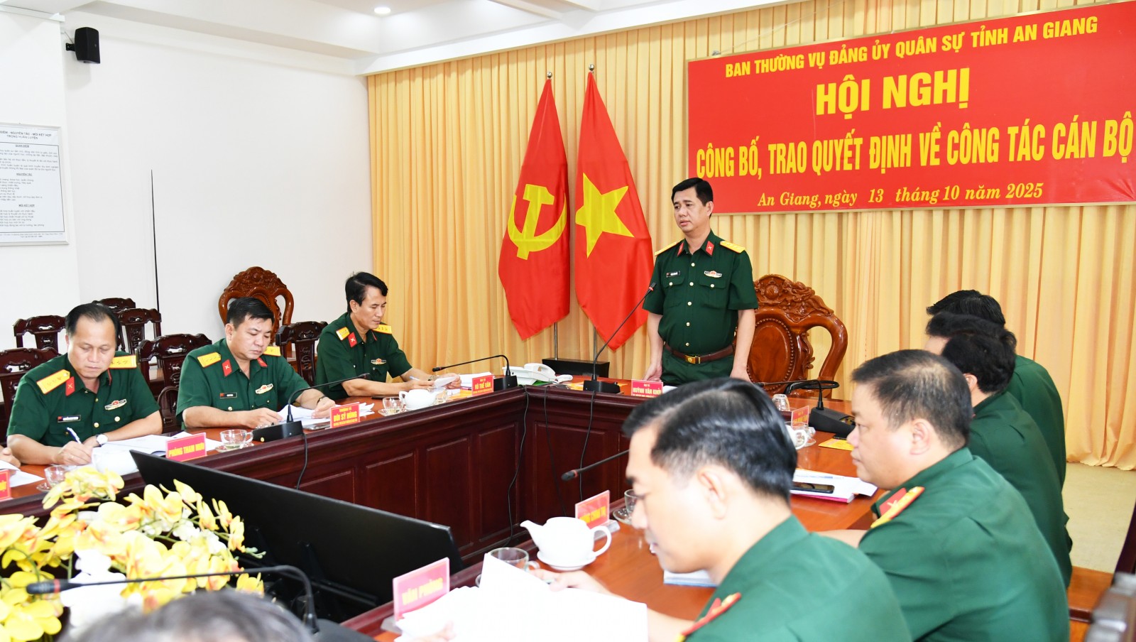 Tại hội nghị, Thượng tá Lê Văn Sáng, Chủ nhiệm Chính trị Bộ Chỉ huy Quân sự tỉnh đã công bố các quyết định của Bộ Tư lệnh Quân khu 9 về việc cán bộ nghỉ việc hưởng chế độ bảo hiểm xã hội, nghỉ chờ hưu và quyết định điều động, bổ nhiệm chức vụ cán bộ.