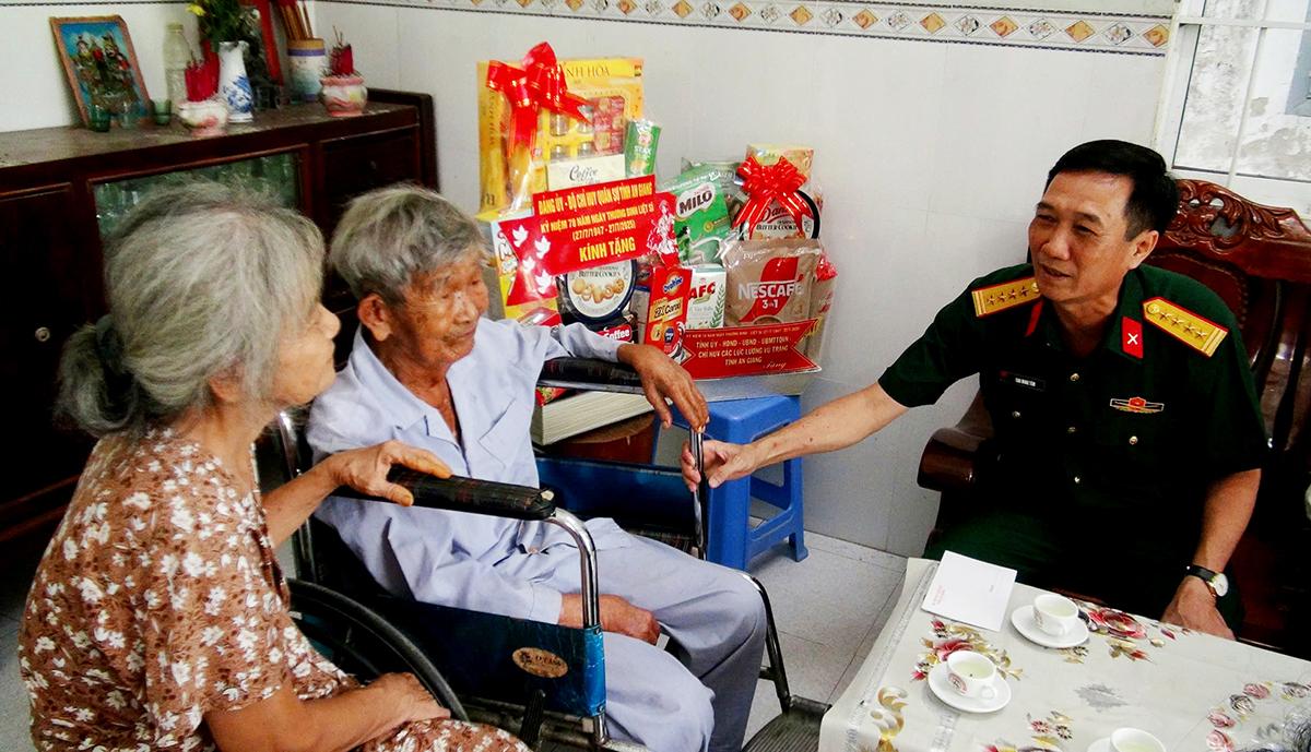 Đại tá Cao Minh Tâm thăm hỏi và tặng quà Anh hùng Lực lượng vũ trang Nhân dân, đại tá Lê Thành Cư.