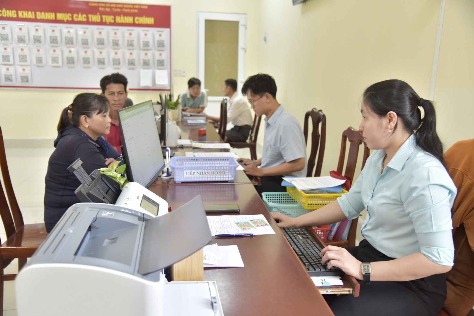Công việc của Nguyên tuy đơn giản nhưng đòi hỏi sự kiên nhẫn gồm hướng dẫn bấm số thứ tự, kiểm tra thông tin hồ sơ xin việc, hỗ trợ viết đơn, rồi chuyển đến chuyên viên tiếp nhận. Những trường hợp chưa có định danh mức độ 2, để tránh mất thời gian của người dân, Nguyên chủ động dùng chính VNeID của mình để nộp phí cho thủ tục khai sinh chỉ 8.000 đồng rồi thu lại sau. Cách làm ấy giúp quy trình trơn tru, không ai phải chờ đợi quá lâu.