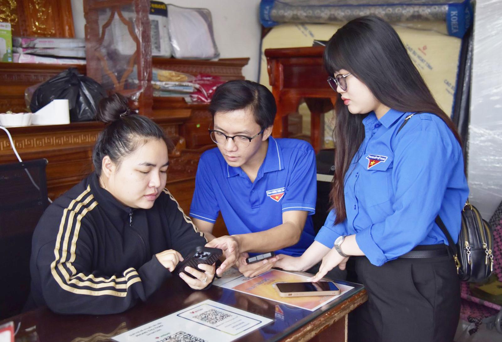 Bí thư Chi đoàn ấp Láng Sơn Trần Thị Ngọc Hà (bên trái) hướng dẫn làm hồ sơ xin việc trực tuyến.