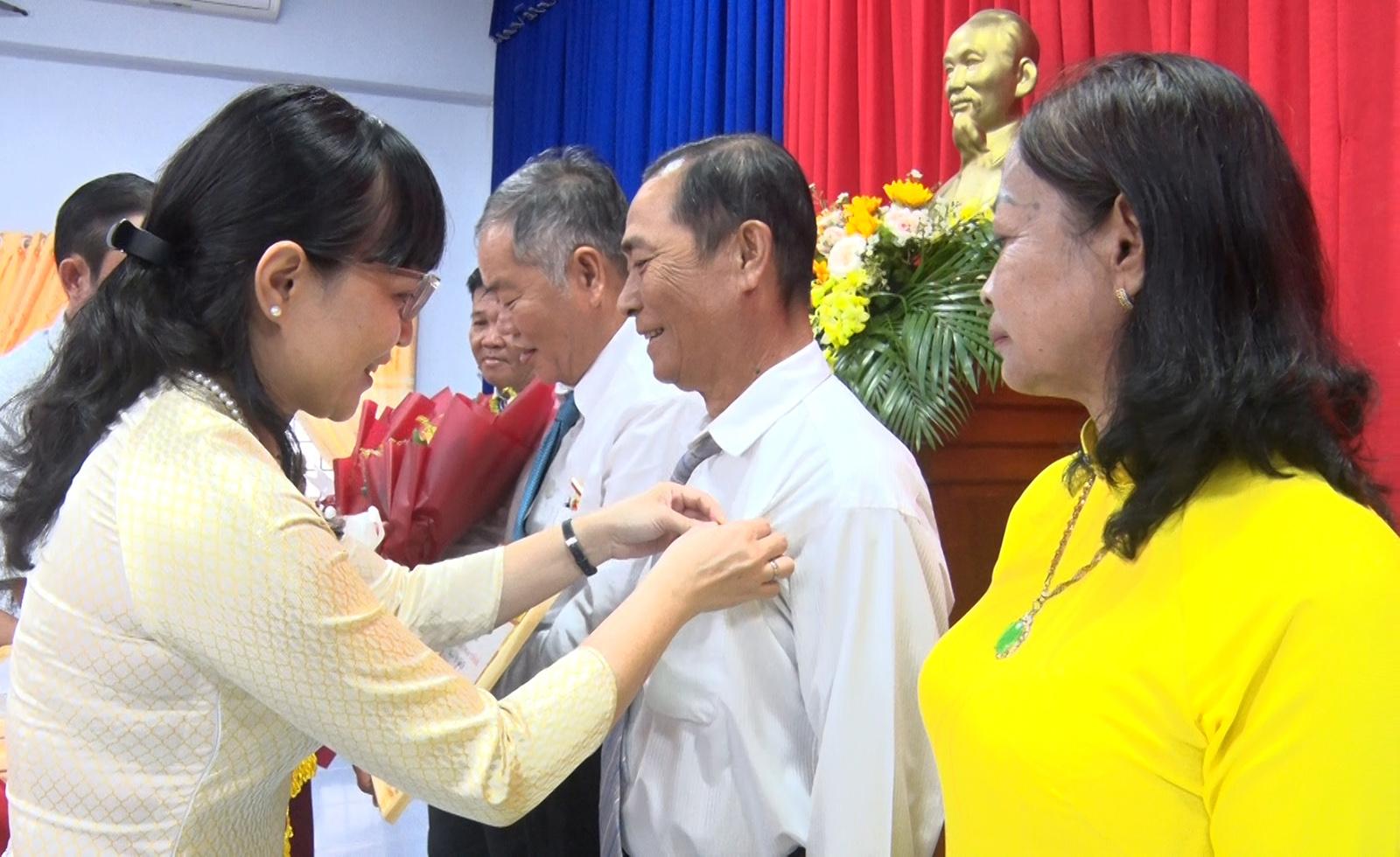 Đại diện Đảng ủy xã Vĩnh Thạnh Trung trao huy hiệu cho các đảng viên cao niên tuổi Đảng.