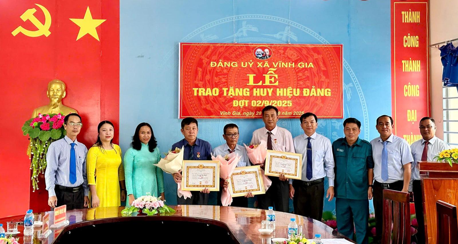 Ban Thường vụ Đảng ủy xã Vĩnh Gia tổ chức lễ trao tặng Huy hiệu Đảng cho 3 đảng viên 30 năm tuổi Đảng, 1 đảng viên 50 năm tuổi Đảng. Các đảng viên sinh hoạt tại Đảng bộ UBND xã Vĩnh Gia, Chi bộ ấp Vĩnh Hiệp, Chi bộ ấp Giồng Cát, Chi bộ ấp Vĩnh Hòa.